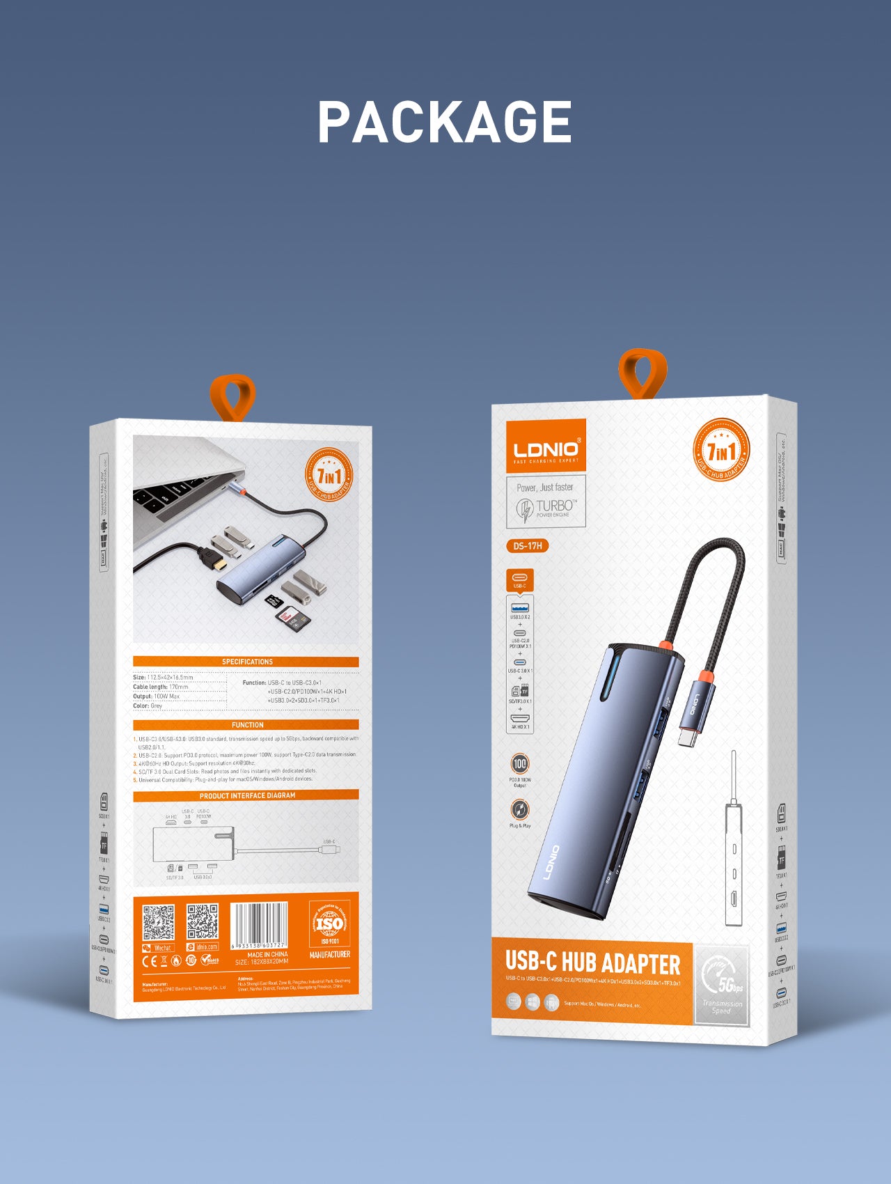 محطة إرساء متعددة المنافذ LDNIO DS-17H 7 في 1 USB-C – HDMI بدقة 4K، USB 3.0، إيثرنت RJ45، قارئ بطاقات SD/TF وشحن سريع PD – محول Type-C للابتوب وماك بوك