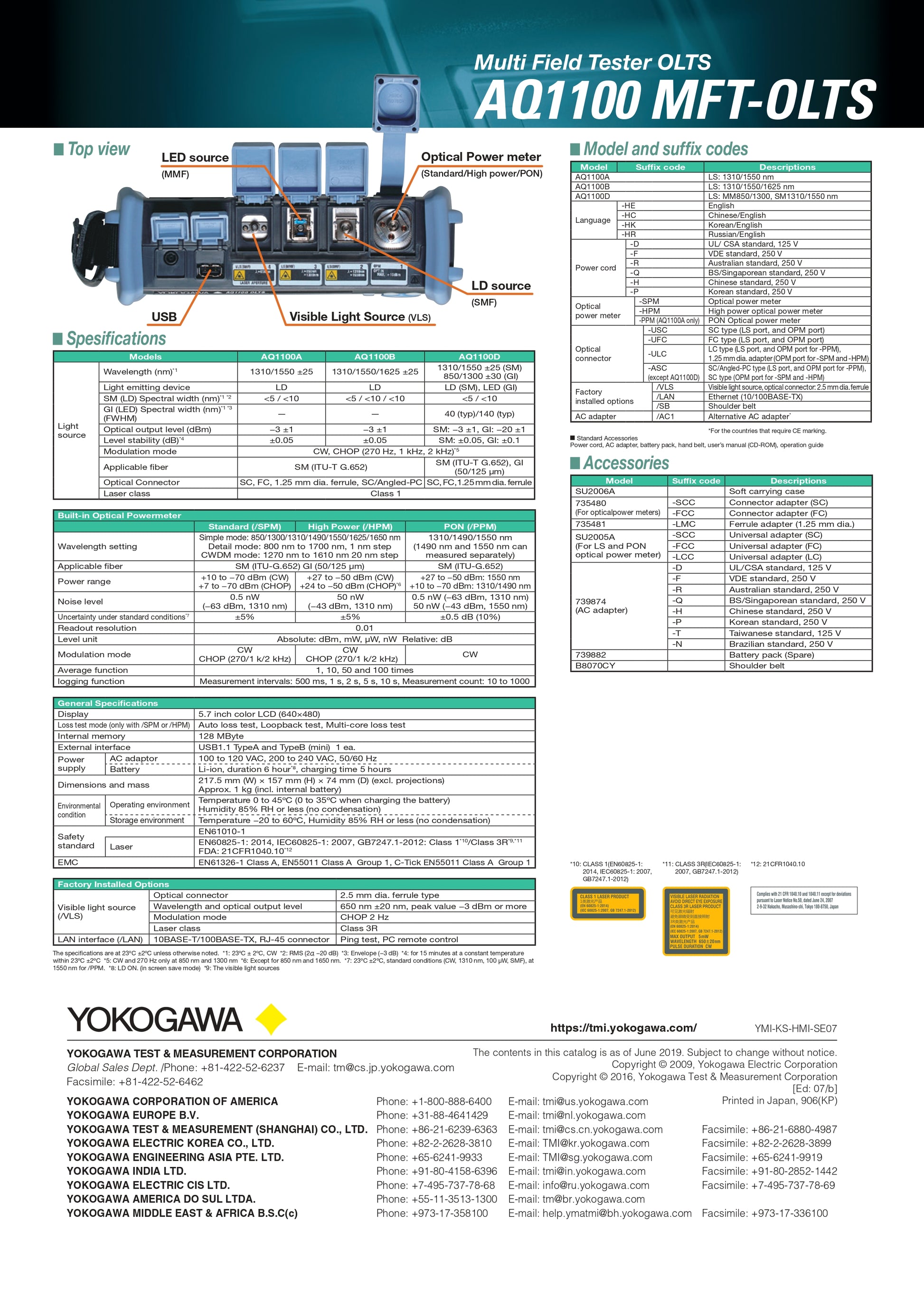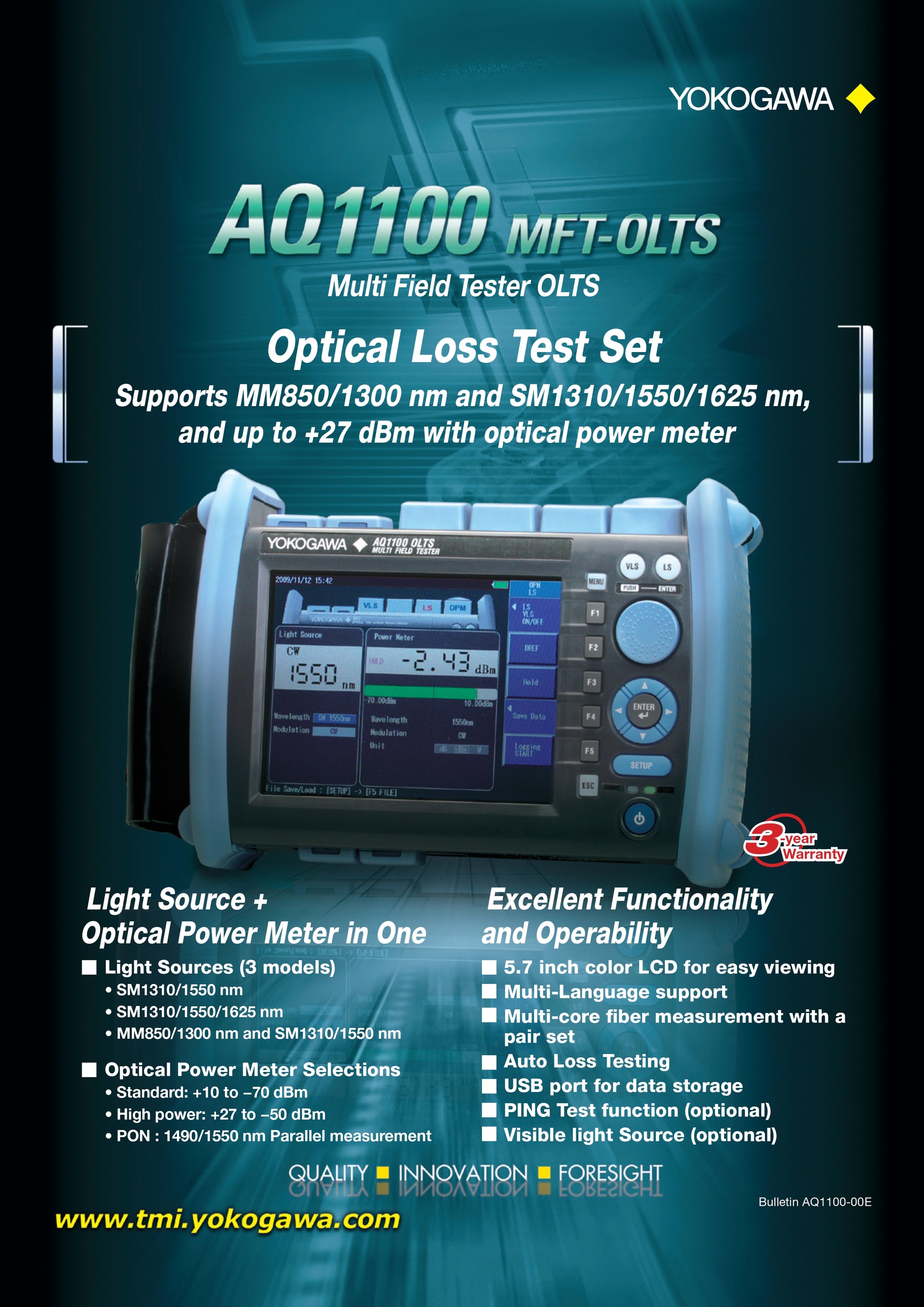 جهاز اختبار فقدان الإشارة الضوئية Yokogawa AQ1100A مع مصدر ضوء 1310/1550 نانومتر، مقياس طاقة ضوئية، تسجيل بيانات USB، شاشة LCD