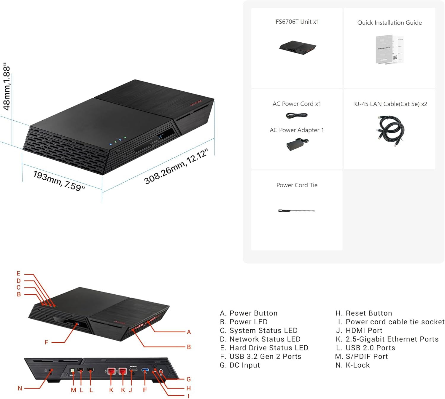 ASUSTOR Flashstor 6 (FS6706T) – جهاز تخزين شبكي (NAS) بست فتحات SSD فقط مع معالج Intel Celeron N5105، وذاكرة DDR4 بسعة 4GB، ومنفذين 2.5GbE، وHDMI 2.0b، وS/PDIF، ودعم تحويل الفيديو بدقة 4K