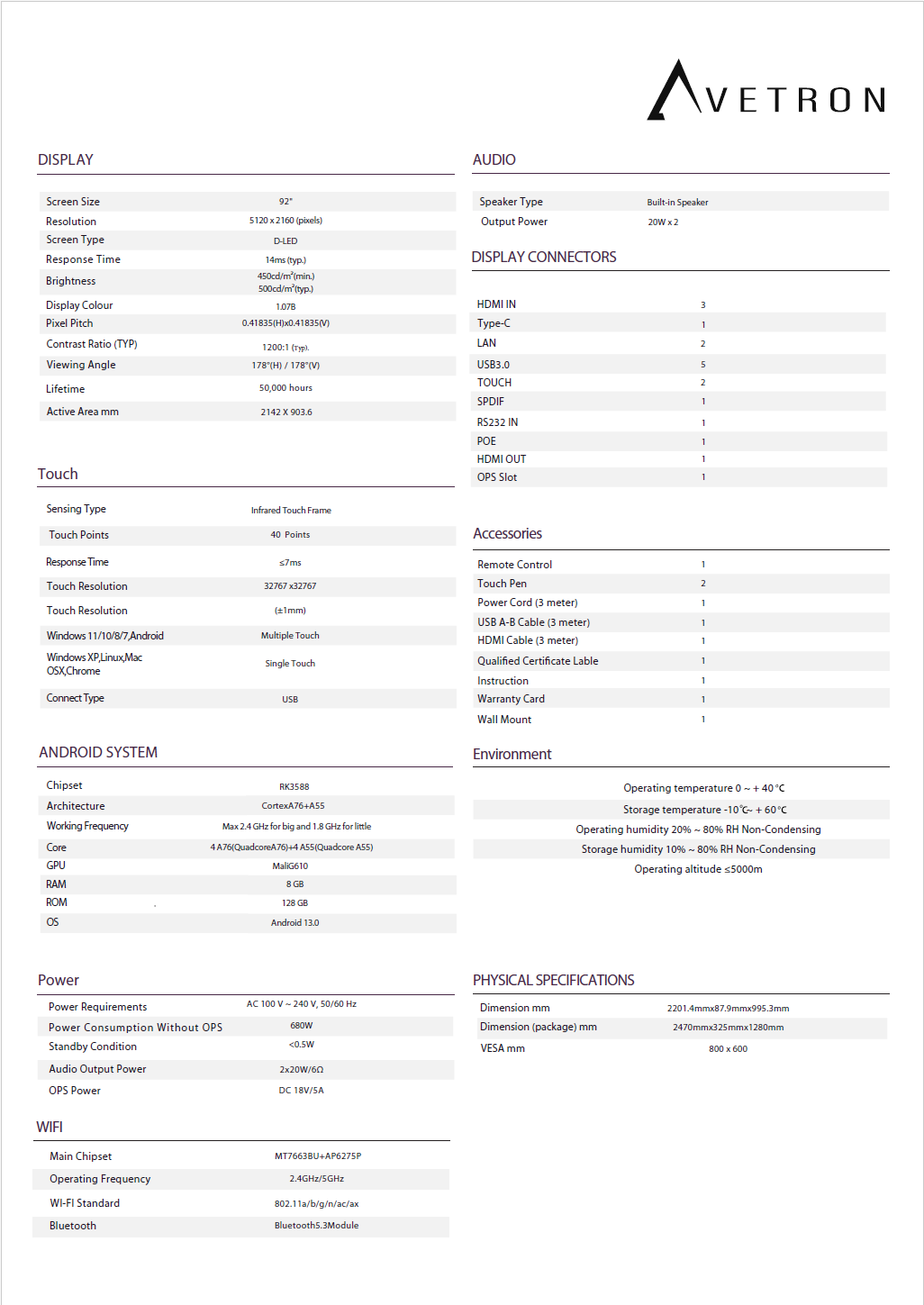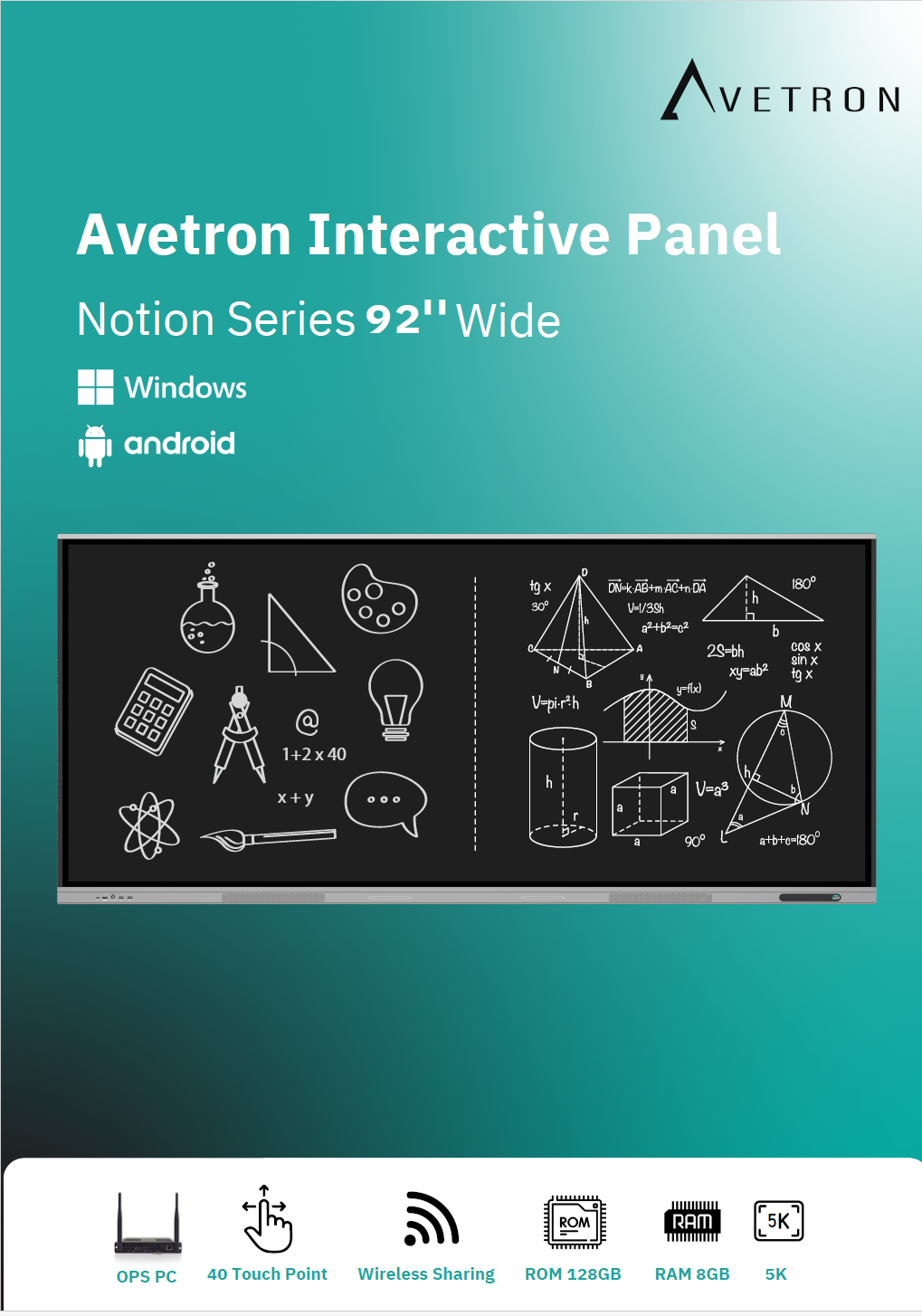 شاشة عرض تفاعلية من سلسلة Avetron Notion مقاس 92 بوصة بدقة 5K، تعمل بنظام Android 13، وذاكرة وصول عشوائي (RAM) سعة 8 جيجابايت، وذاكرة قراءة فقط (ROM) سعة 128 جيجابايت، وتقنية اللمس بالأشعة تحت الحمراء (IR Touch) بـ 40 نقطة، ومكبرات صوت مزدوجة بقوة 20 وات