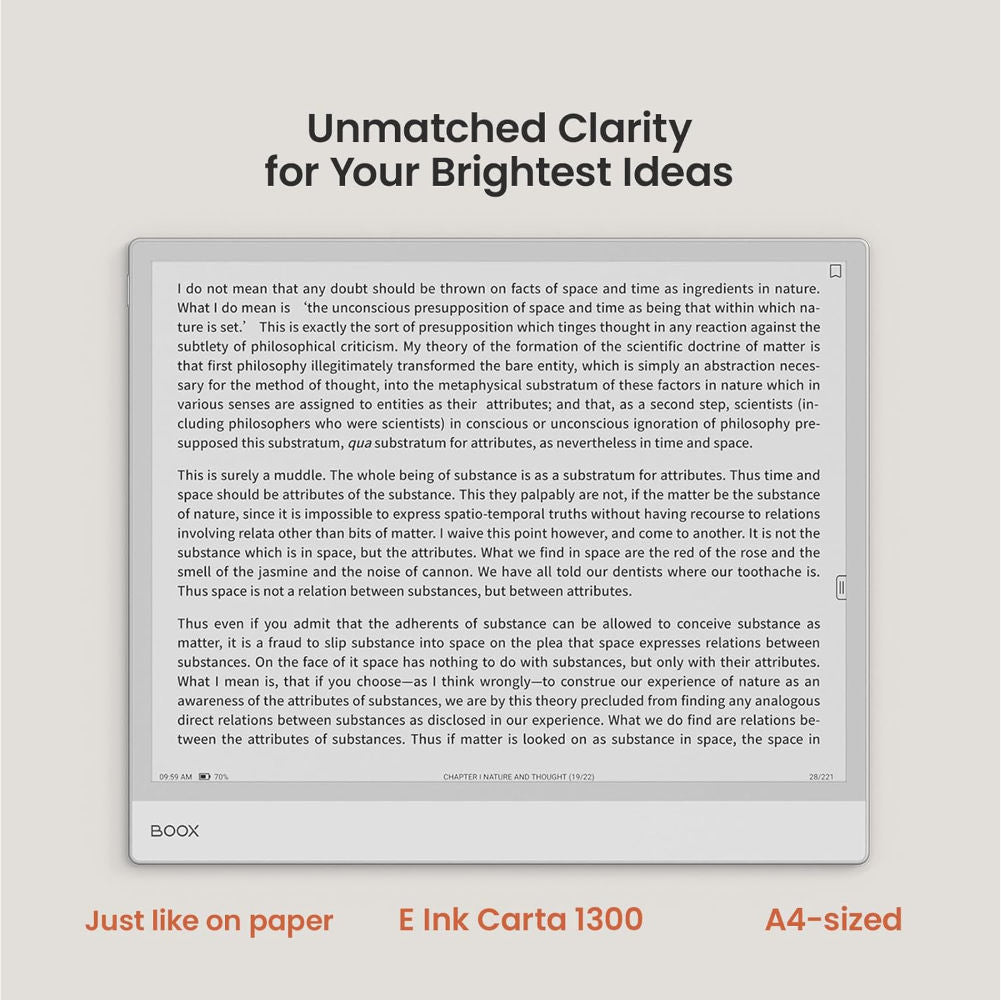 - شاشة E Ink Carta 1300 بحجم 13.3 بوصة: دقة 3200 × 2400 (300 نقطة في البوصة) لنصوص وصور فائقة الوضوح.