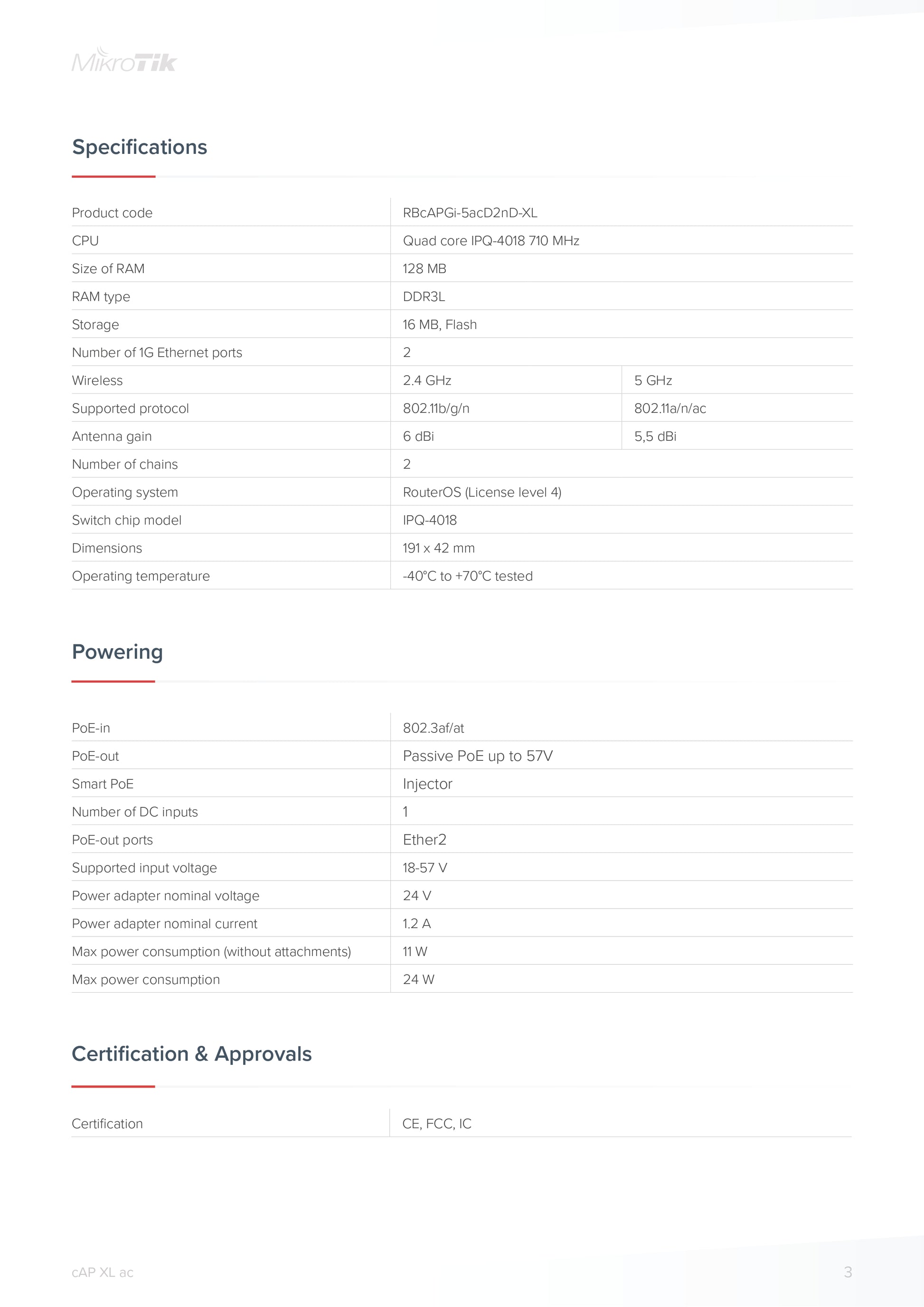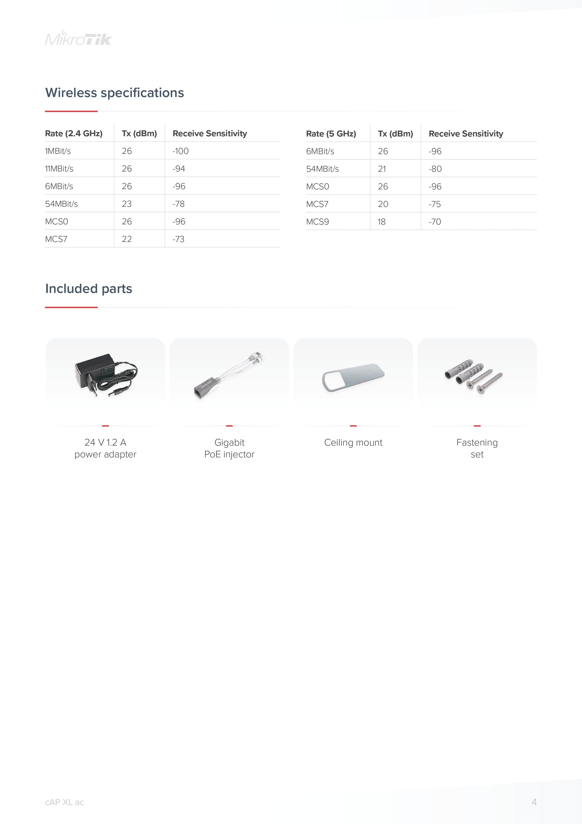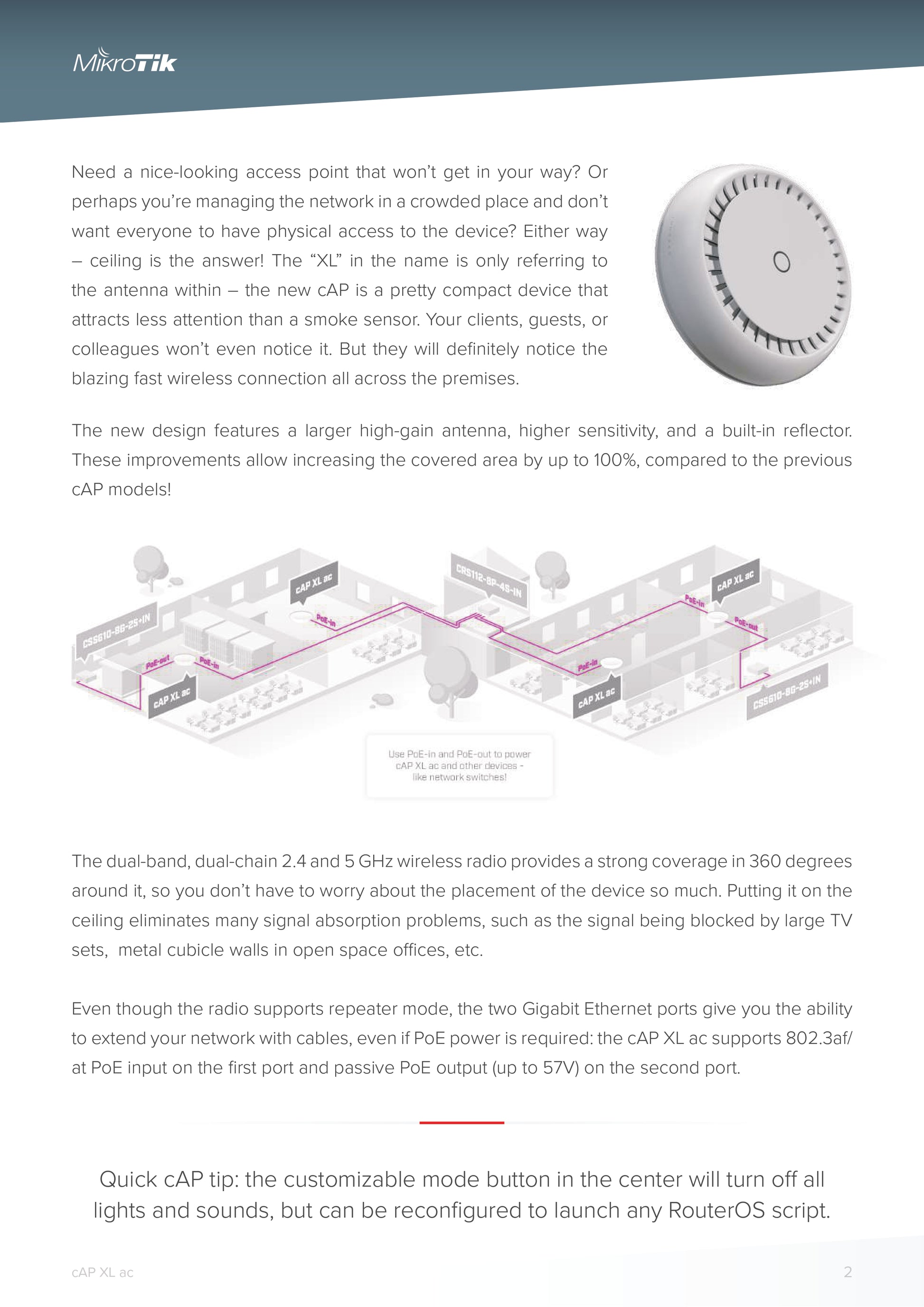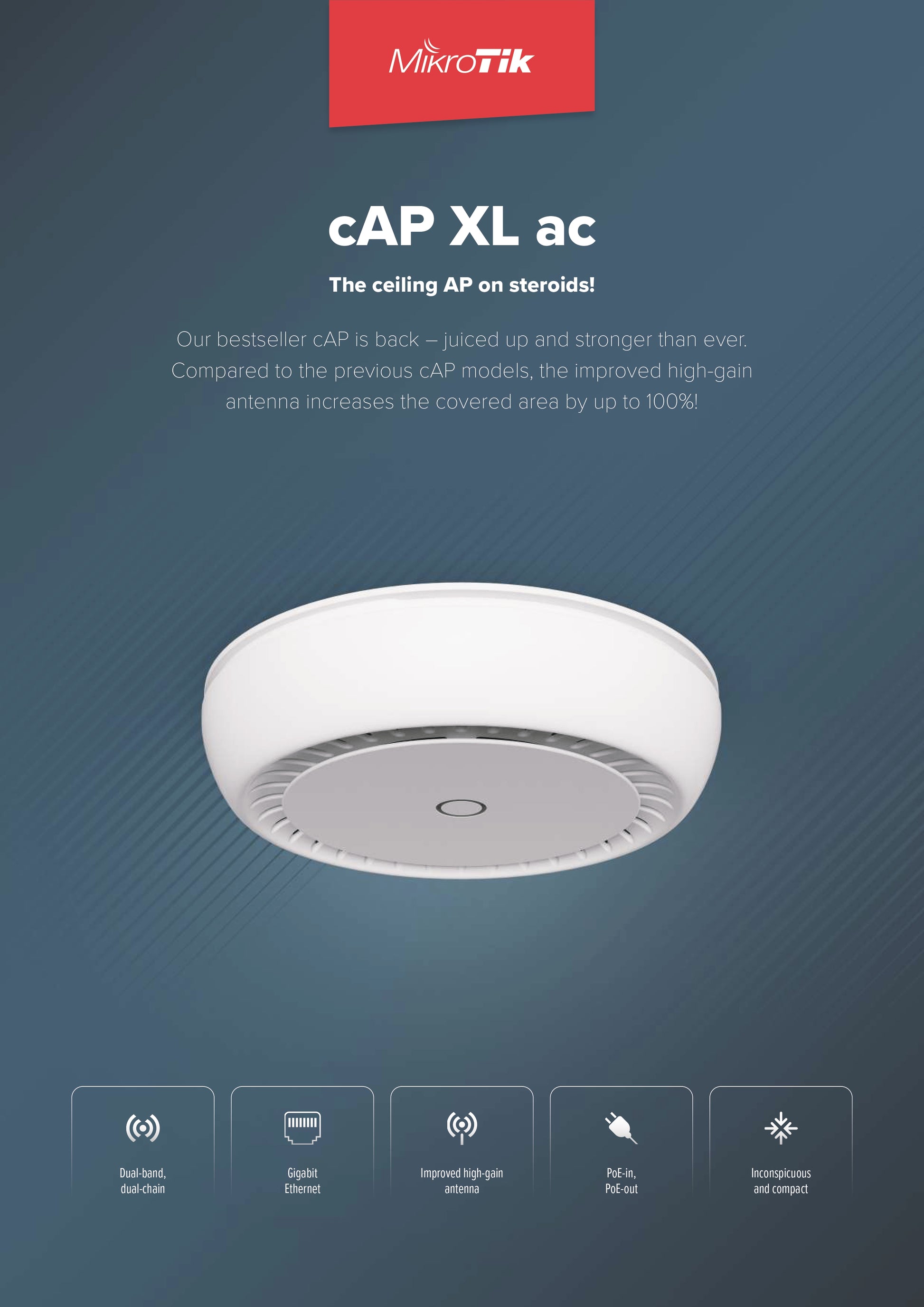 جهاز MikroTik cAP XL ac هو نقطة وصول لاسلكية قوية ومُحكمة التركيب، تُثبّت في السقف، مثالية للبيئات عالية الكثافة مثل المكاتب والفنادق والأماكن العامة. يوفر تصميم الهوائي المُحسّن عالي الكسب وحساسيته المُحسّنة تغطيةً أكبر بنسبة تصل إلى 100% مقارنةً بطرازات cAP السابقة.