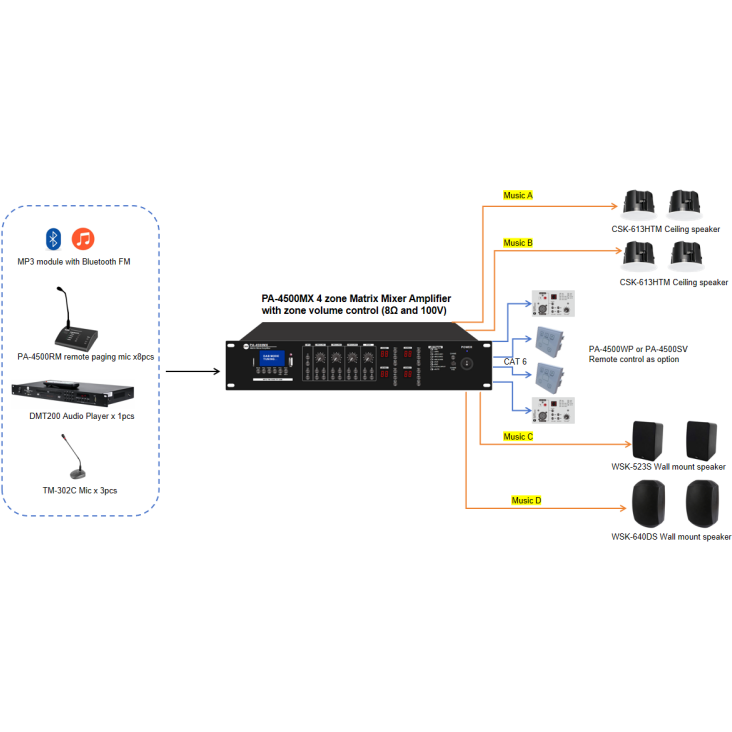 مضخم صوت CMX PA-4500MX رباعي المناطق مزود بمنفذ USB وبطاقة SD وFM وبلوتوث و3 مداخل ميكروفون ومخرجات 100 فولت/70 فولت/8 أوم