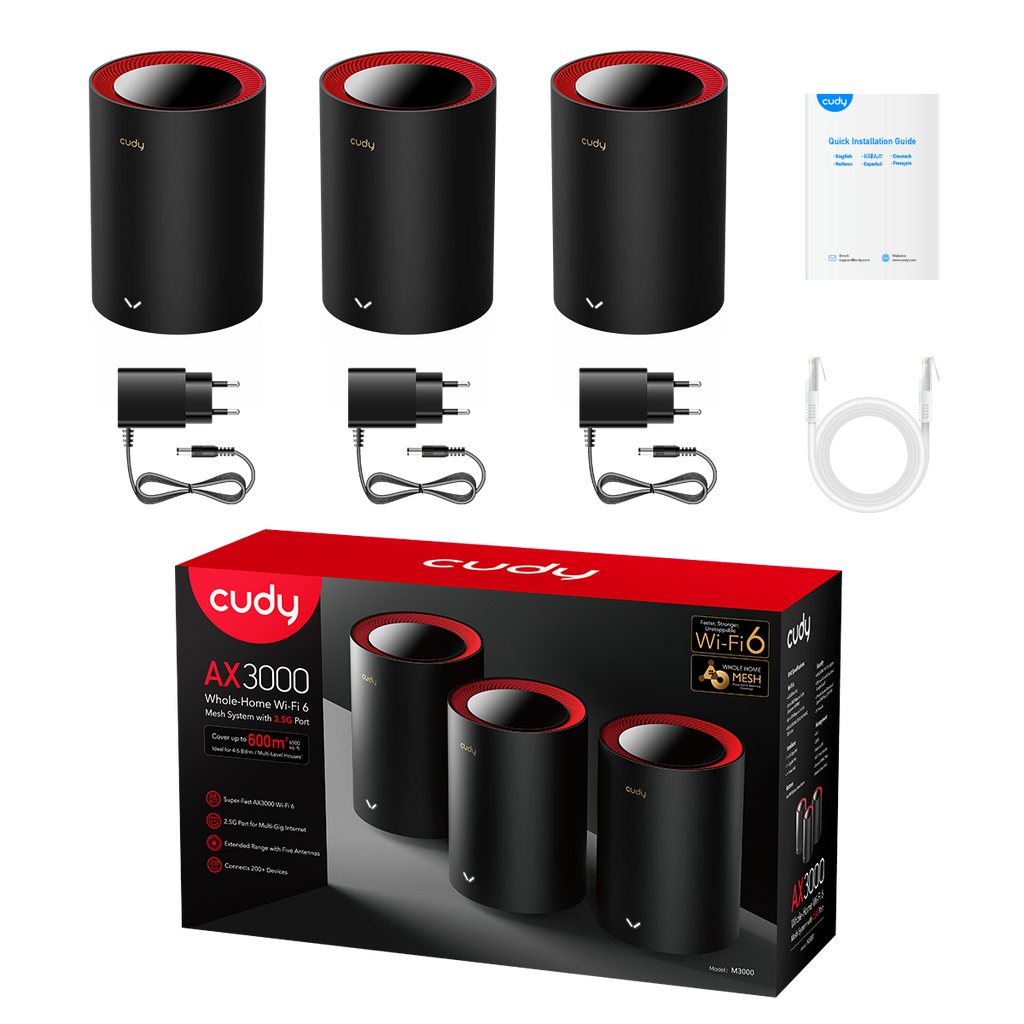 The Cudy M3000 (3-Pack) is a next-generation Wi-Fi 6 AX3000 mesh system built to deliver seamless, high-speed, whole-home wireless coverage. Each node provides up to 3000Mbps (2402Mbps @5GHz + 574Mbps @2.4GHz), ensuring smooth 4K streaming, online gaming, and smart home connectivity across large multi-room spaces.