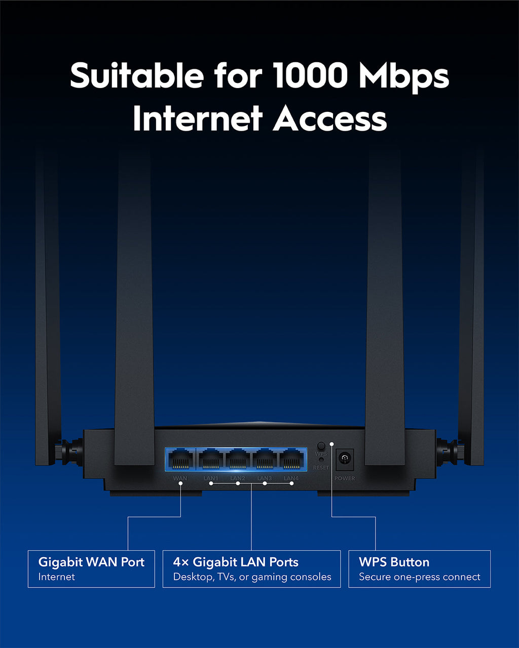 Gigabit Ethernet Ports: Includes 1× Gigabit WAN and 4× Gigabit LAN ports for high-speed wired connections.