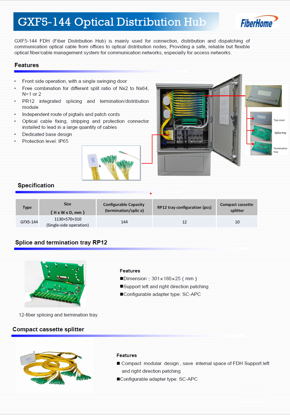 FiberHome GXF5-144 وحدة توزيع ألياف – 144 نواة، درج RP12، SC/APC، جاهز للتقسيم المدمج، IP65، أبعاد 1130×570×310 مم، وصول أمامي