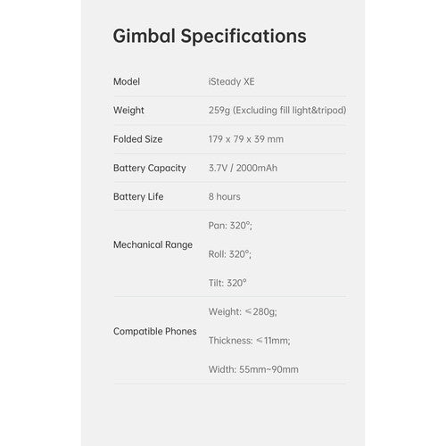 - التركيب والتشغيل السريع: أولاً، افتح iSteady XE، ثم شدّ المقبض، مع تثبيت الهاتف الذكي في المنتصف، هذا كل شيء! سيبدأ العمل بعد تشغيله.