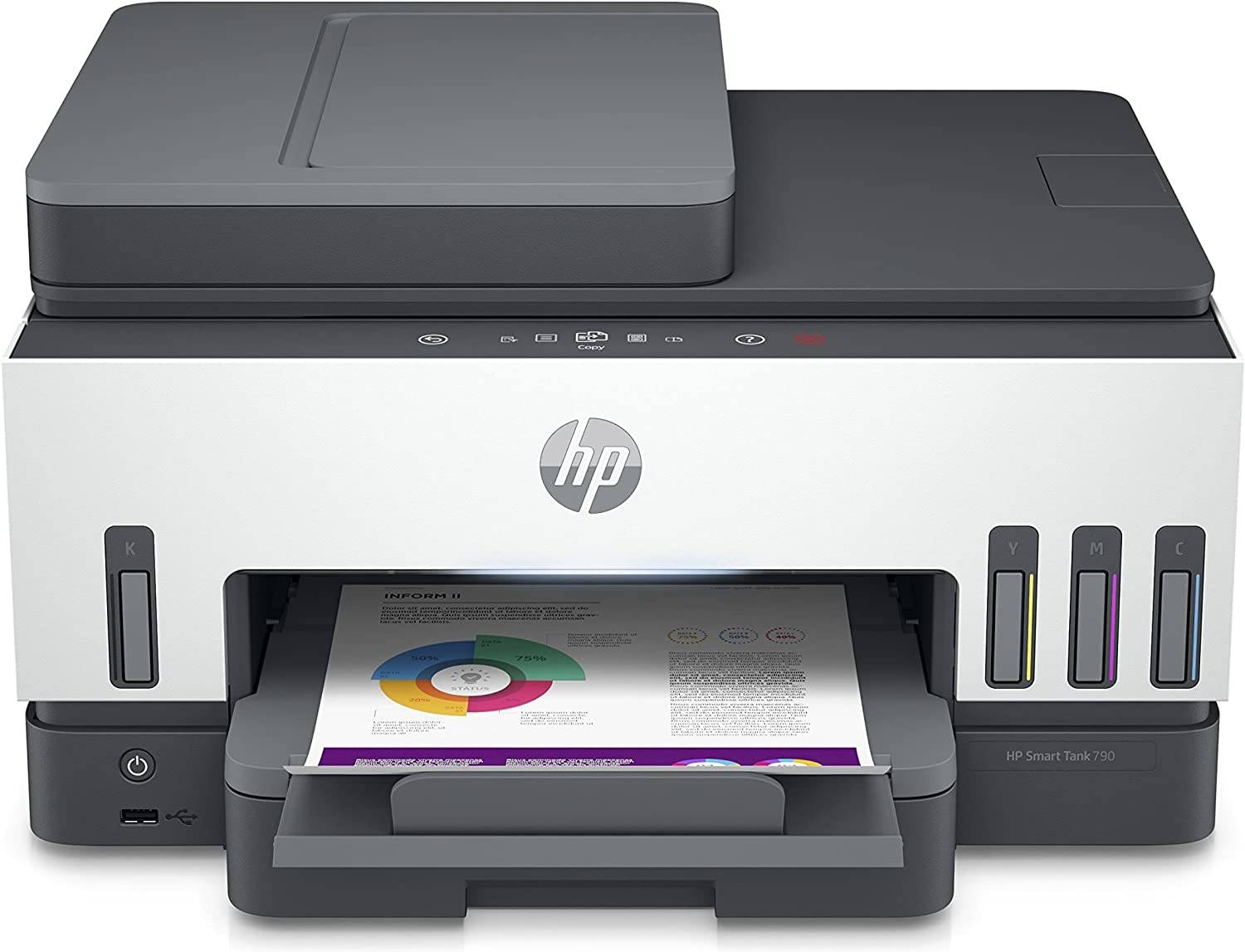 طابعة HP Smart Tank 790 الكل في واحد، طباعة مزدوجة تلقائية، وحدة تغذية تلقائية للمستندات ولوحة لمس سحرية، سرعة طباعة 23 صفحة في الدقيقة، USB وWiFi وBluetooth وLAN، طباعة متنقلة، سعة إخراج 100 ورقة، أبيض-رمادي