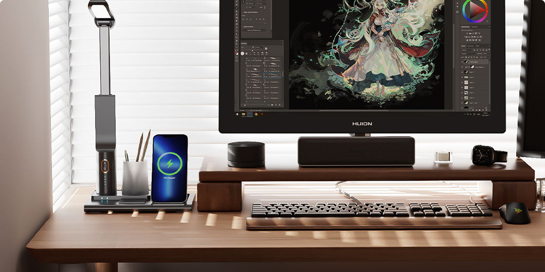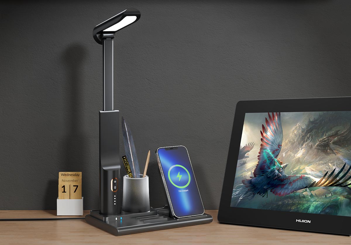 مصباح المكتب متعدد الاستخدامات من HUION هو حل إضاءة مبتكر مصمم للمنازل والمكاتب العصرية. يتميز بإضاءة LED قابلة للتعديل، وشحن لاسلكي، ومنفذ USB، ليجمع بين الراحة والعملية في تصميم أنيق واحد.