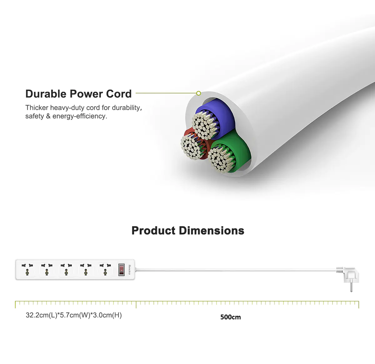 شريط طاقة هانتكي SSZ501 بخمسة منافذ بمقبس المملكة المتحدة، سلك بطول 5 أمتار، قوة قصوى 2500 واط، مقاوم للهب، مصاريع أمان للأطفال، مفتاح فصل مزدوج