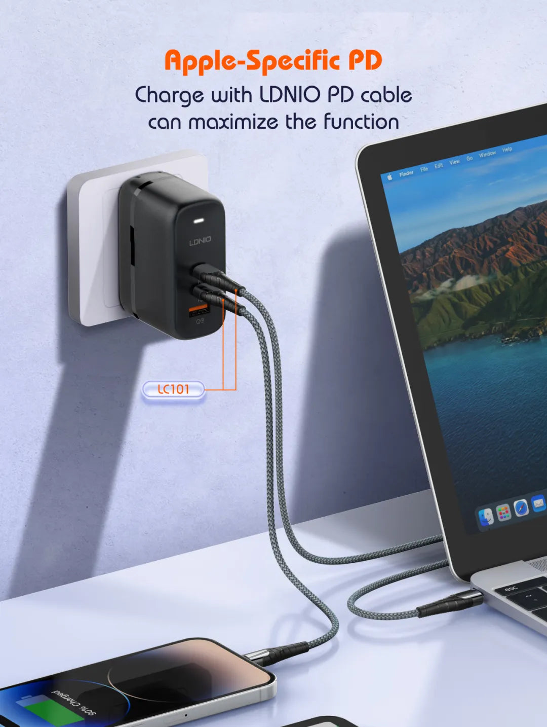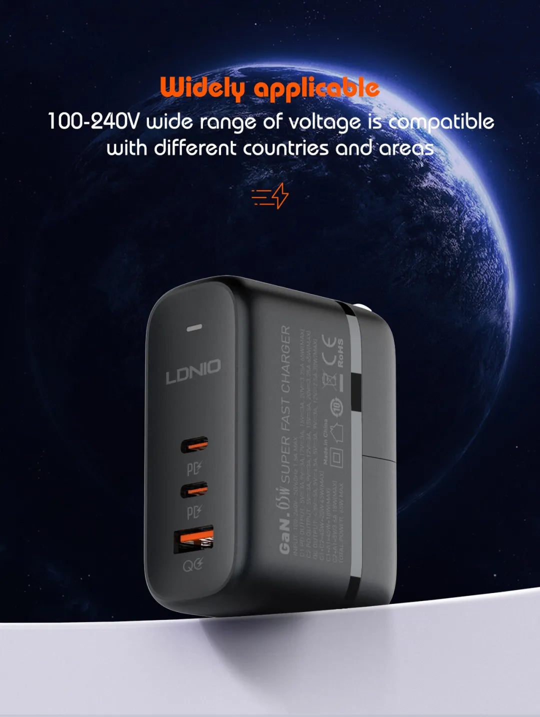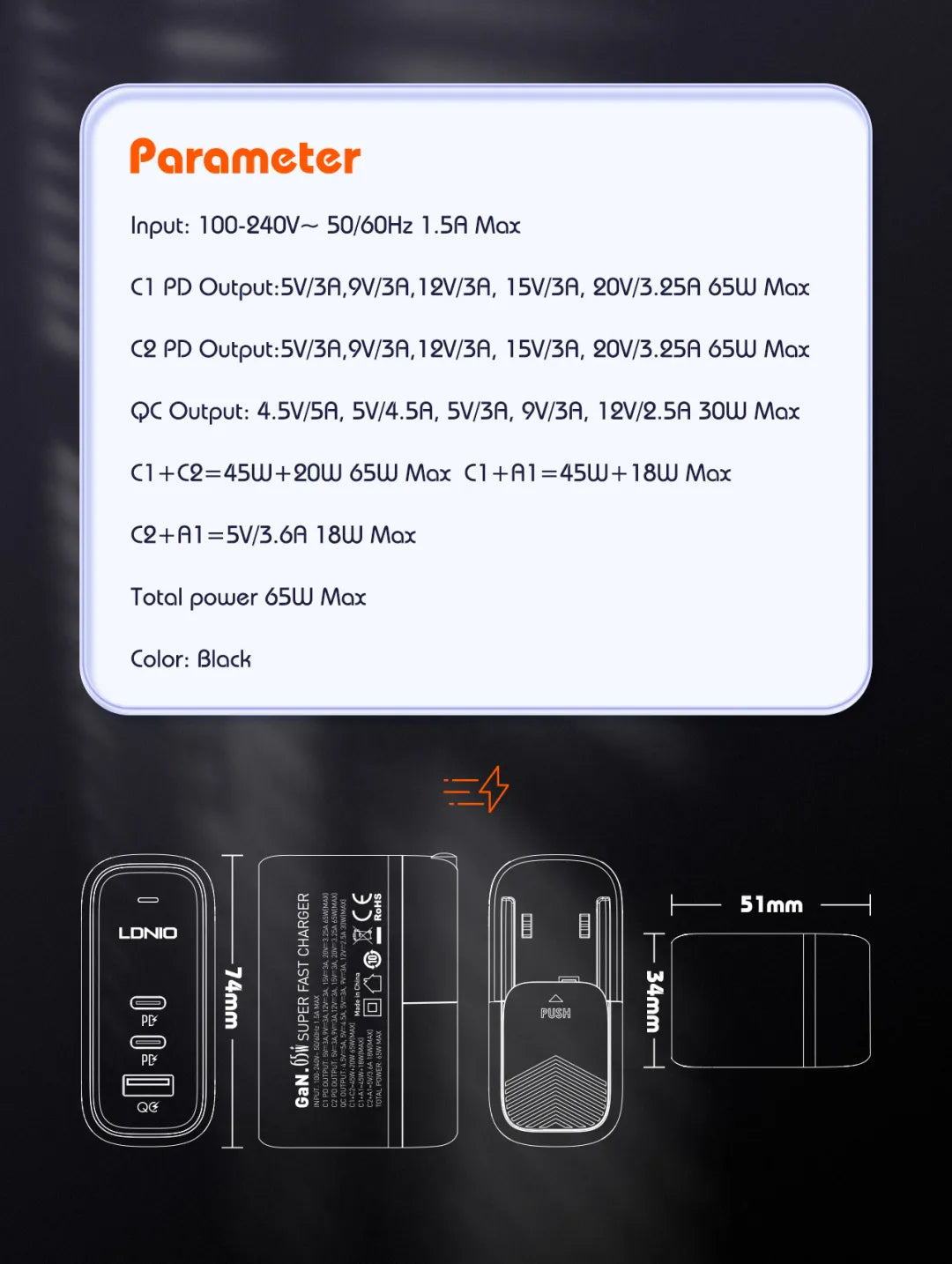 - USB-C2 Output: 5V/3A, 9V/3A, 12V/3A, 15V/3A, 20V/3.25A (65W Max)