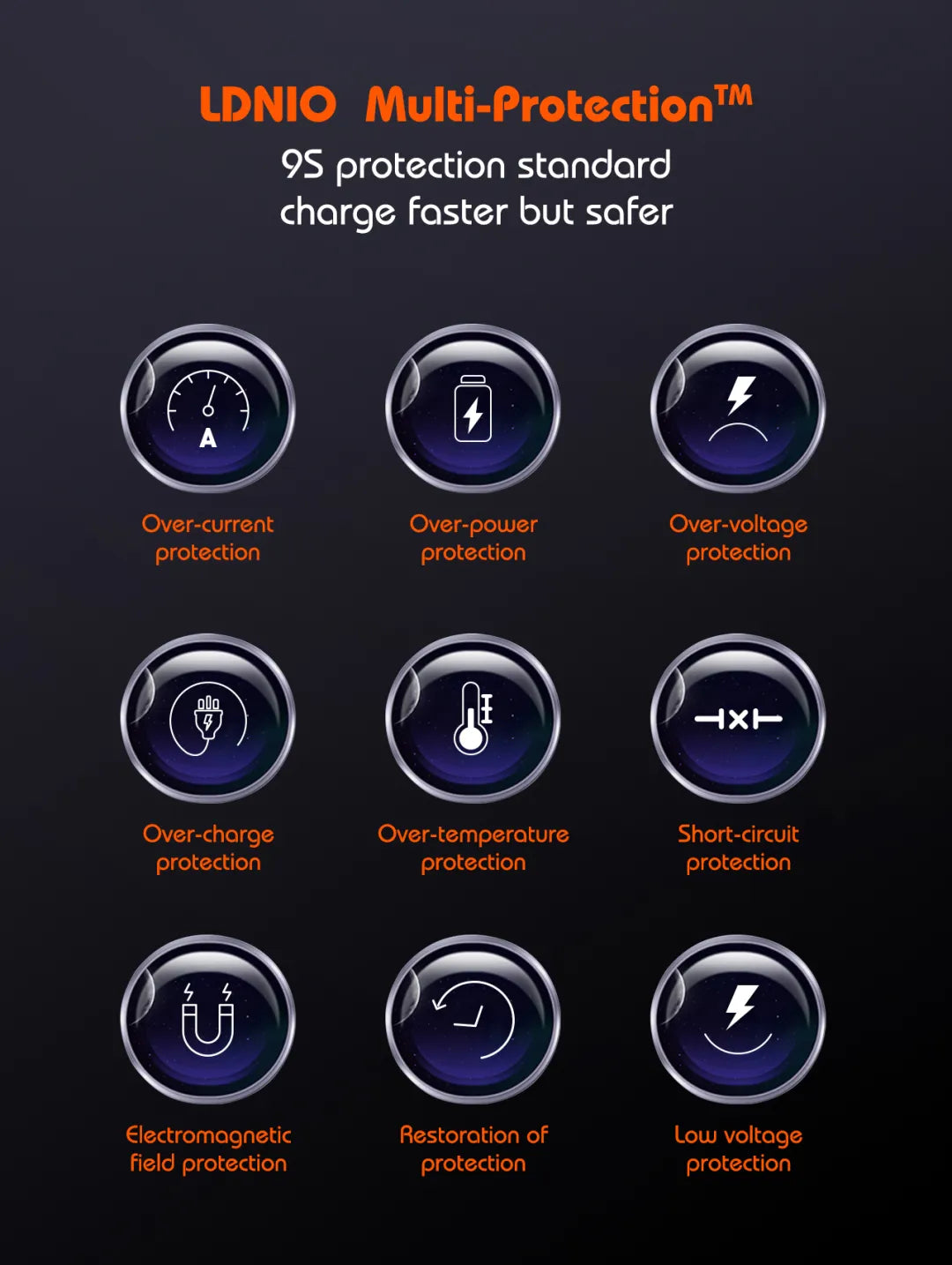 - مخرج USB-A1: 4.5 فولت/5 أمبير، 5 فولت/4.5 أمبير، 9 فولت/3 أمبير، 12 فولت/2.5 أمبير (30 واط كحد أقصى)