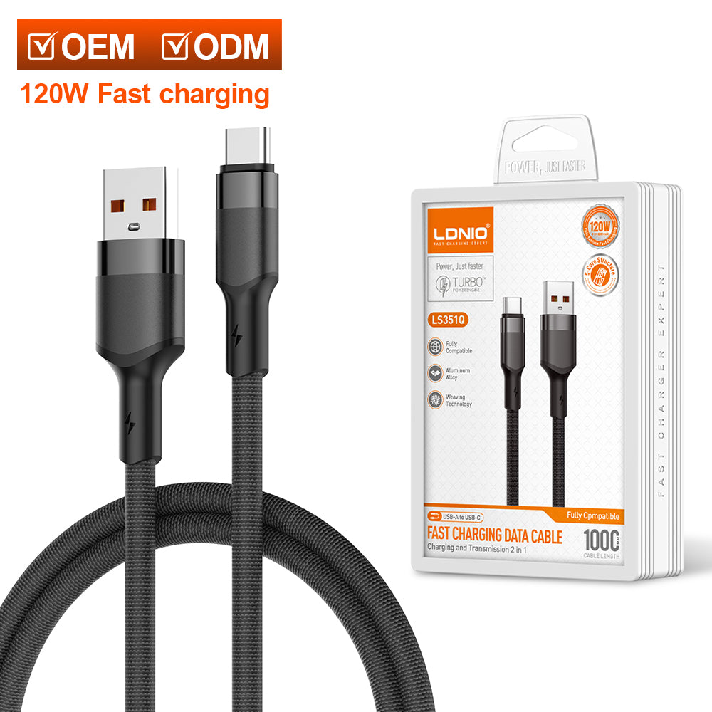 كابل شحن سريع محمي USB بقوة 120 واط من LDNIO موديل LS351Q، كابل بيانات نوع C بطول 1 متر لأجهزة iOS والهواتف المحمولة وبنوك الطاقة – مزامنة وشحن عالي السرعة