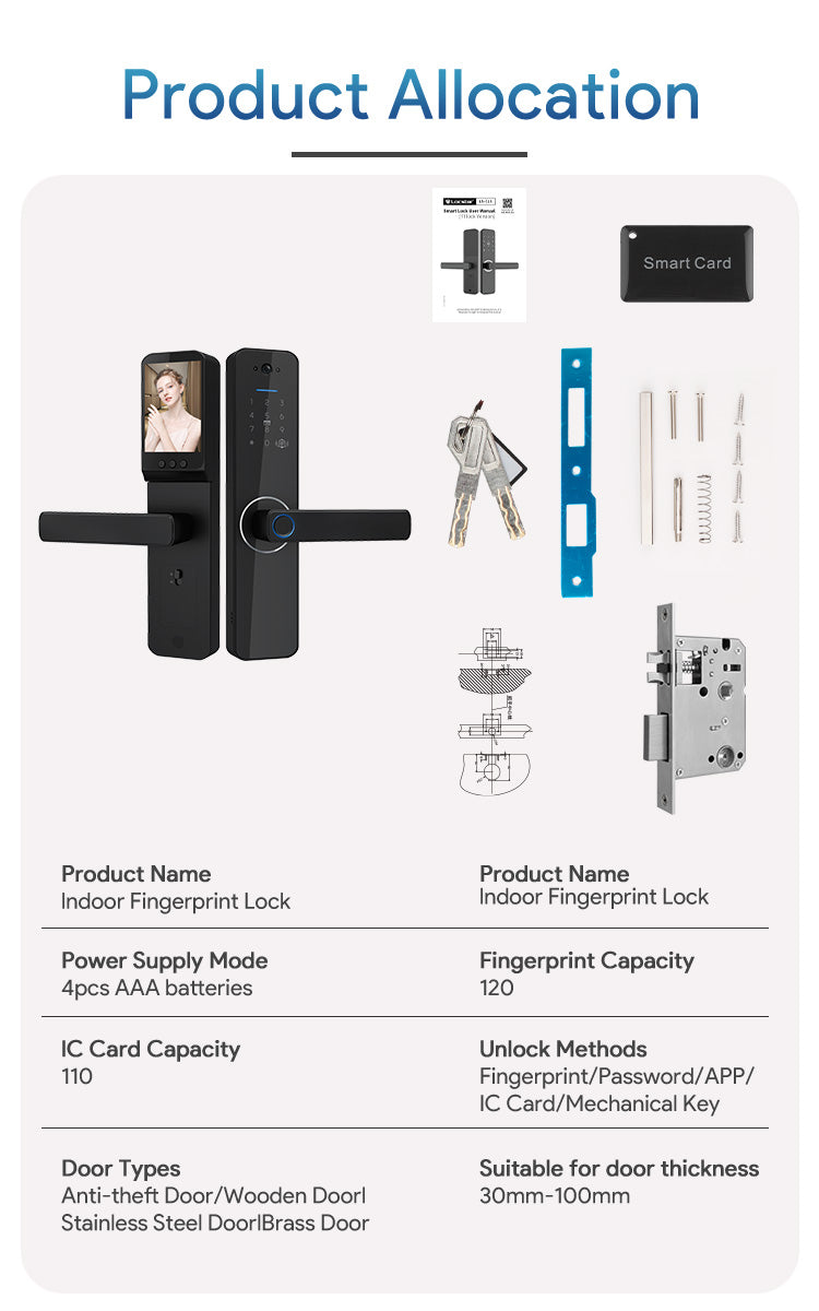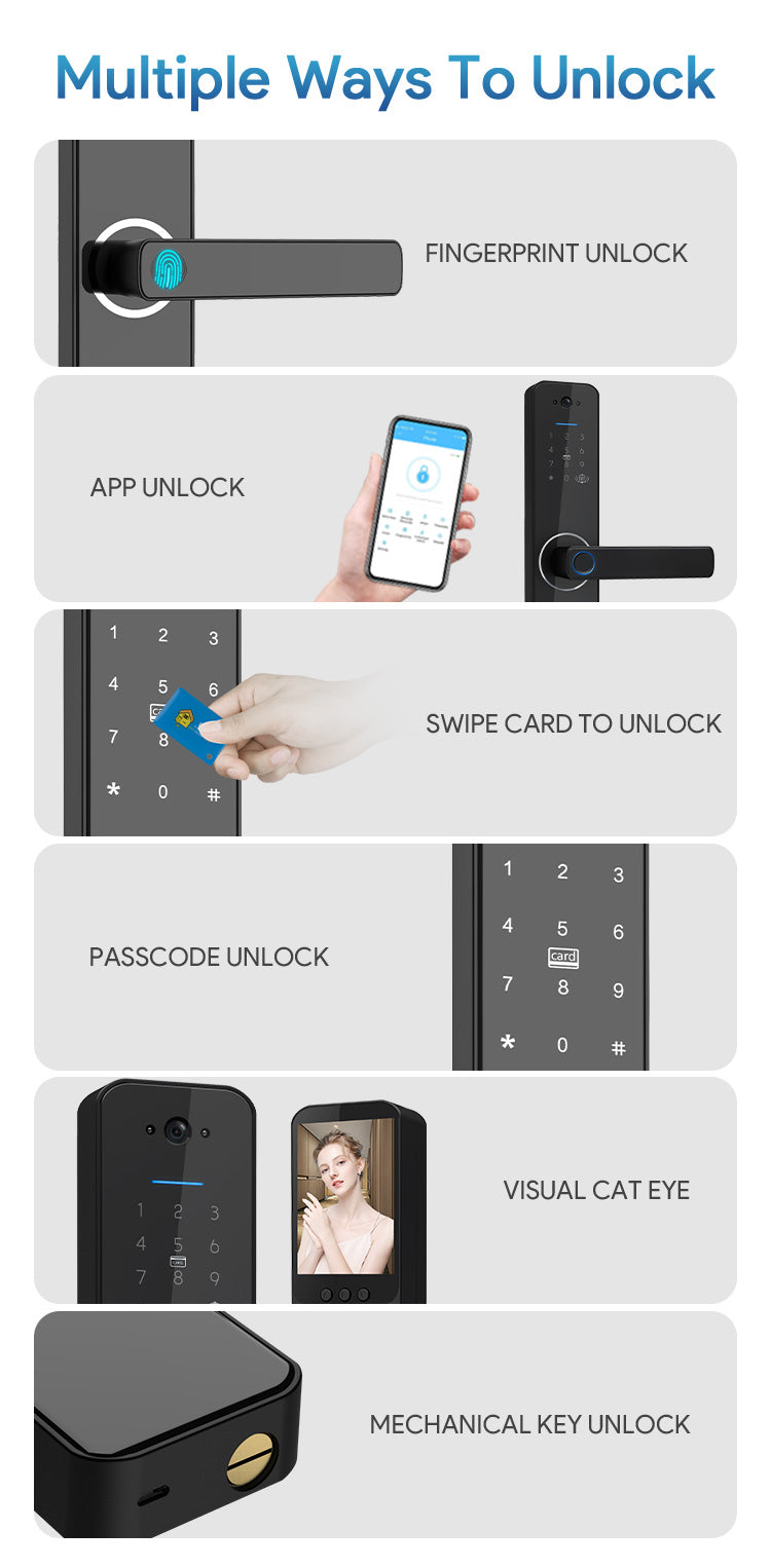 خيارات فتح متعددة: توفر إمكانية الوصول من خلال التطبيق وبصمة الإصبع وكلمة المرور وبطاقة IC والمفتاح الميكانيكي مما يضمن المرونة والراحة لمختلف المستخدمين والمواقف.