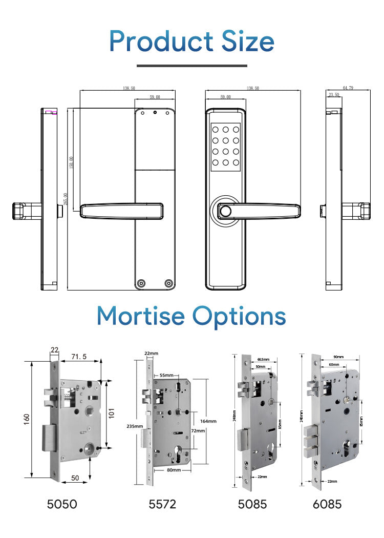 نوع القفل: متوافق مع مزلاج واحد، 5050، و5072 (المعيار 5050)، مما يوفر المرونة لتركيبات الأبواب المختلفة.