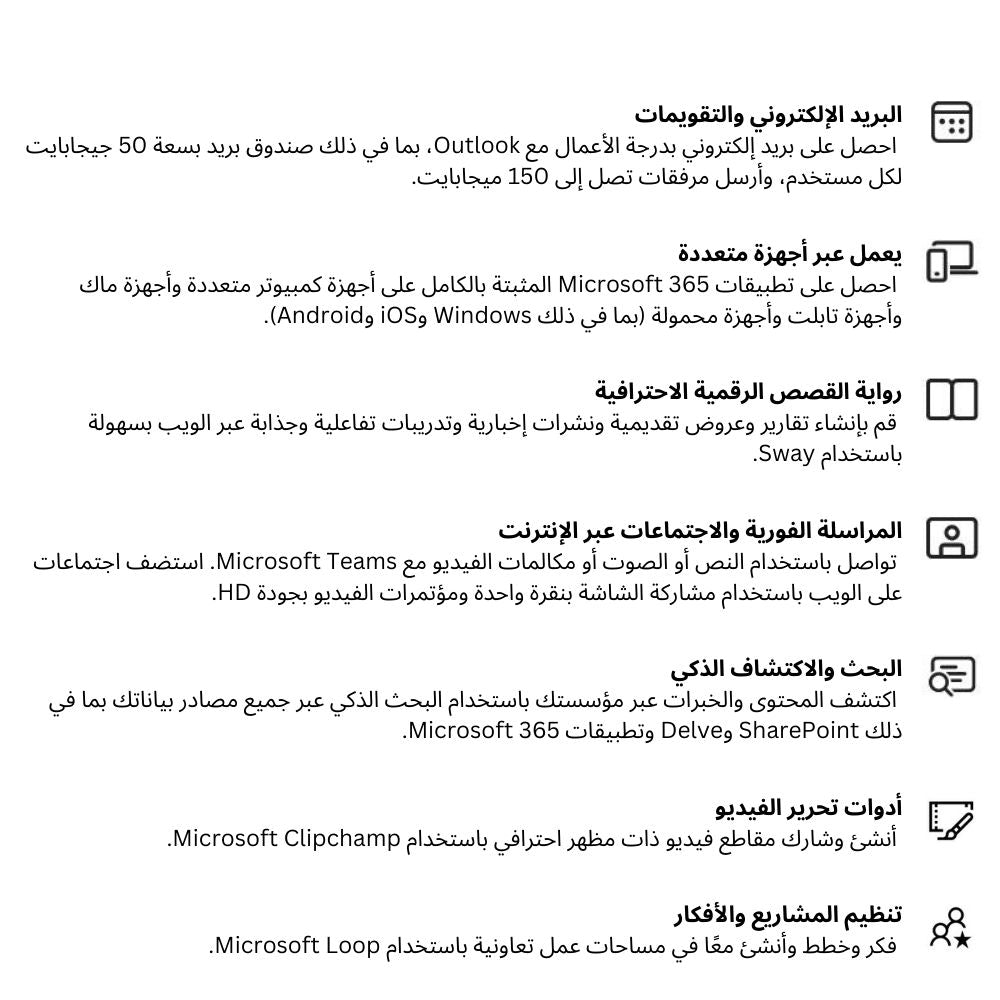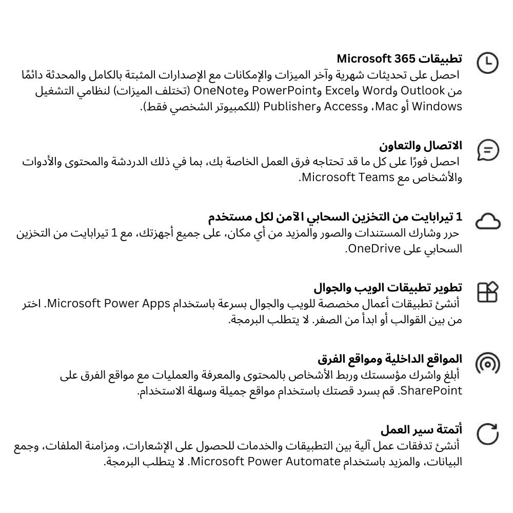 استفد من إصدارات سطح المكتب والويب والهواتف المحمولة القوية للتطبيقات مثل Word وExcel وPowerPoint، والبريد الإلكتروني الخاص بالعمل، ومساحة تخزين سحابية تبلغ 1 تيرابايت، وTeams، وإدارة المستخدمين لما يصل إلى 300 موظف لإدارة أعمالك وتنميتها.