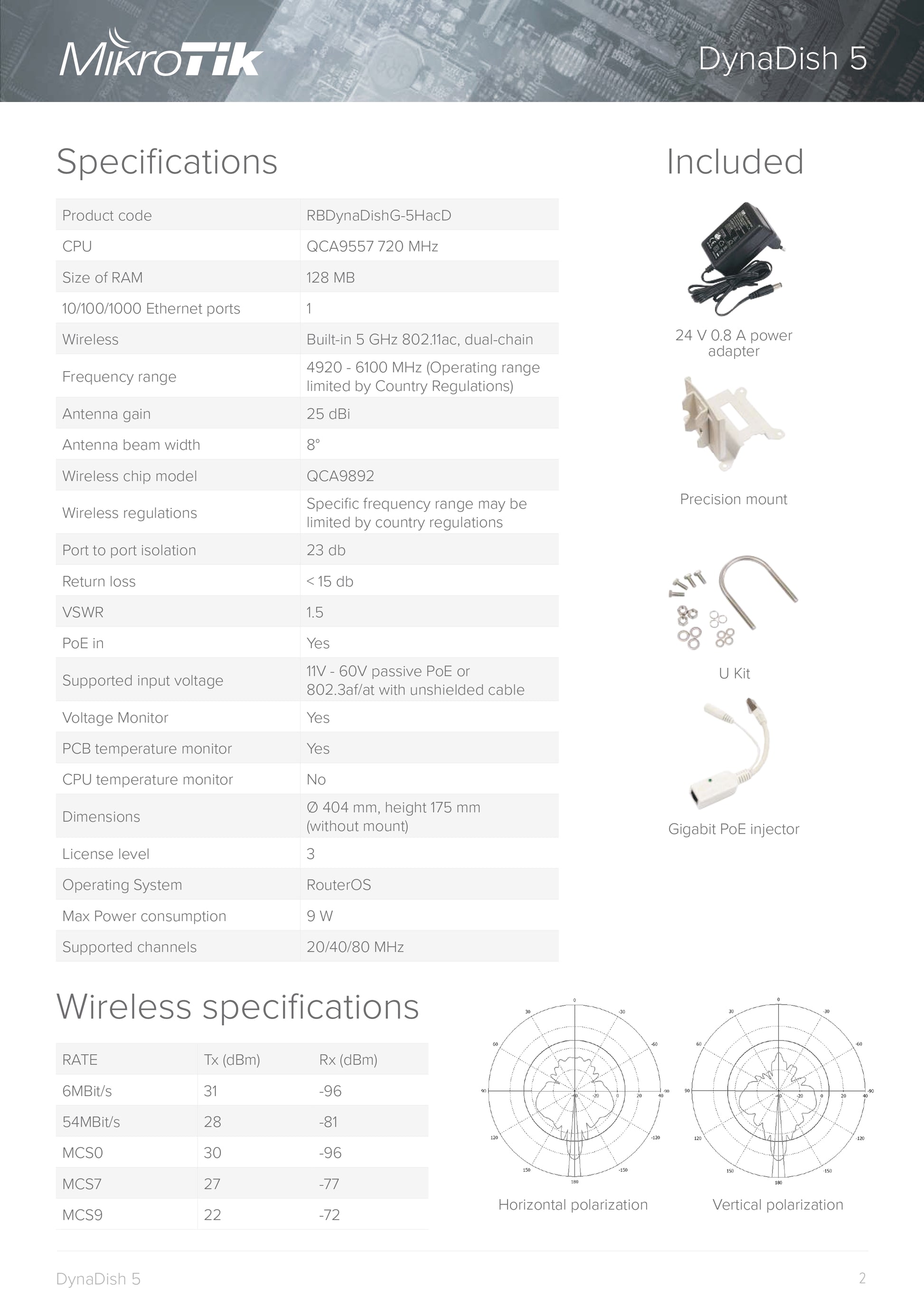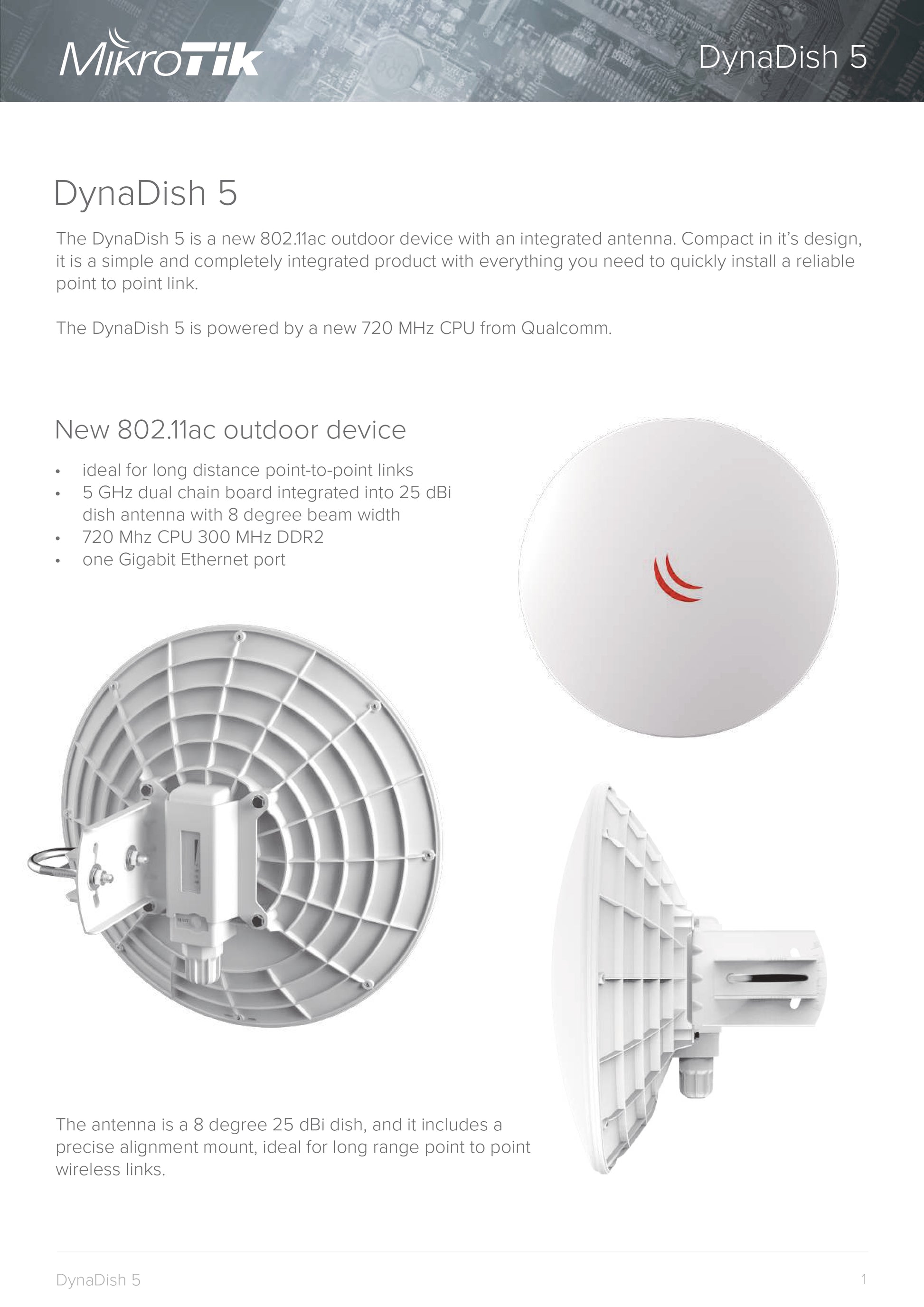 جهاز MikroTik DynaDish 5 هو جهاز لاسلكي خارجي قوي وصغير الحجم يعمل بمعيار 802.11ac، مزود بهوائي مدمج عالي الكسب. صُمم هذا الجهاز للاتصالات اللاسلكية بعيدة المدى من نقطة إلى نقطة، ويوفر أداءً موثوقًا في تصميم بسيط ومتكامل.