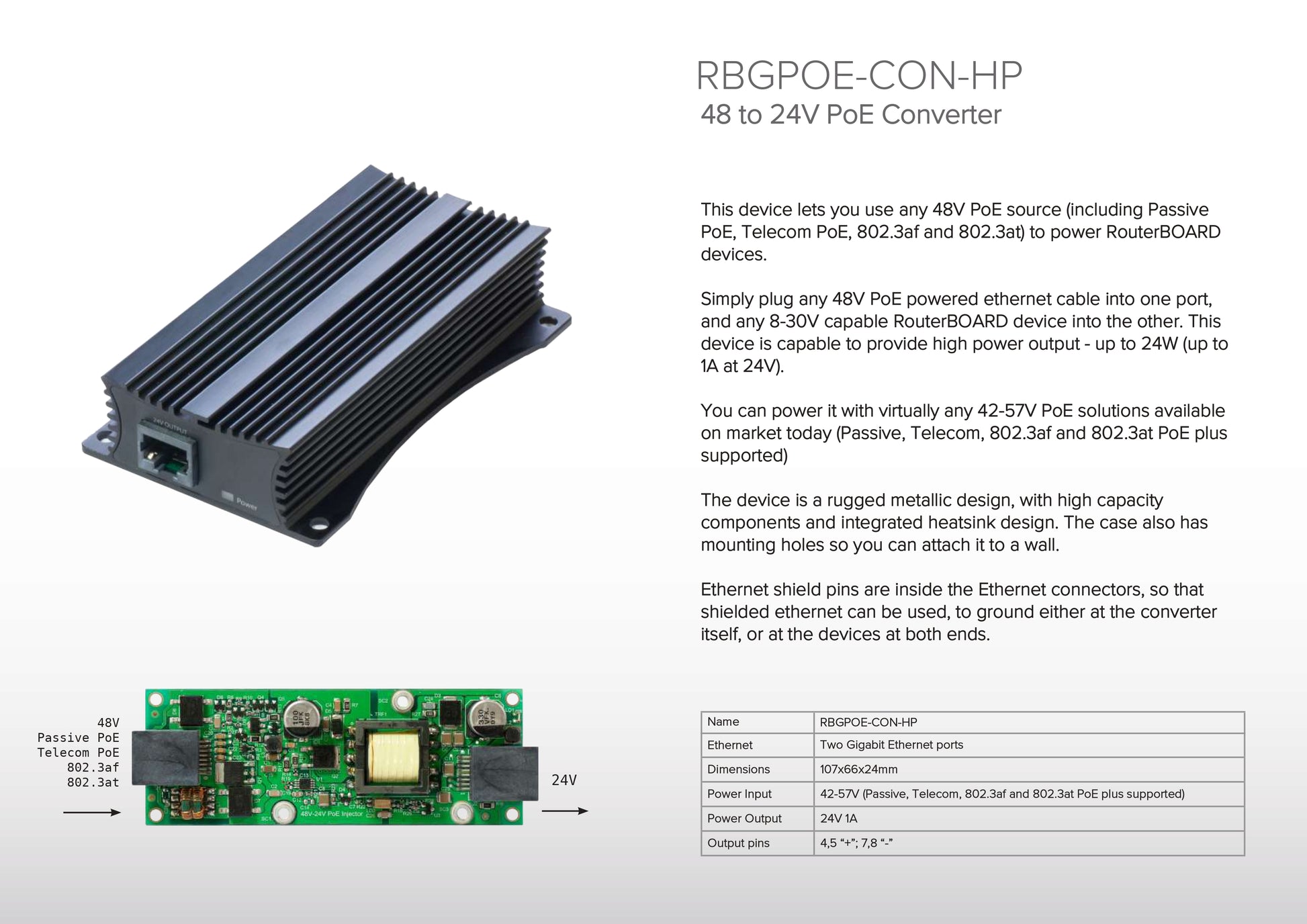 - يحول مدخل 48 فولت PoE إلى مخرج 24 فولت لأجهزة RouterBOARD