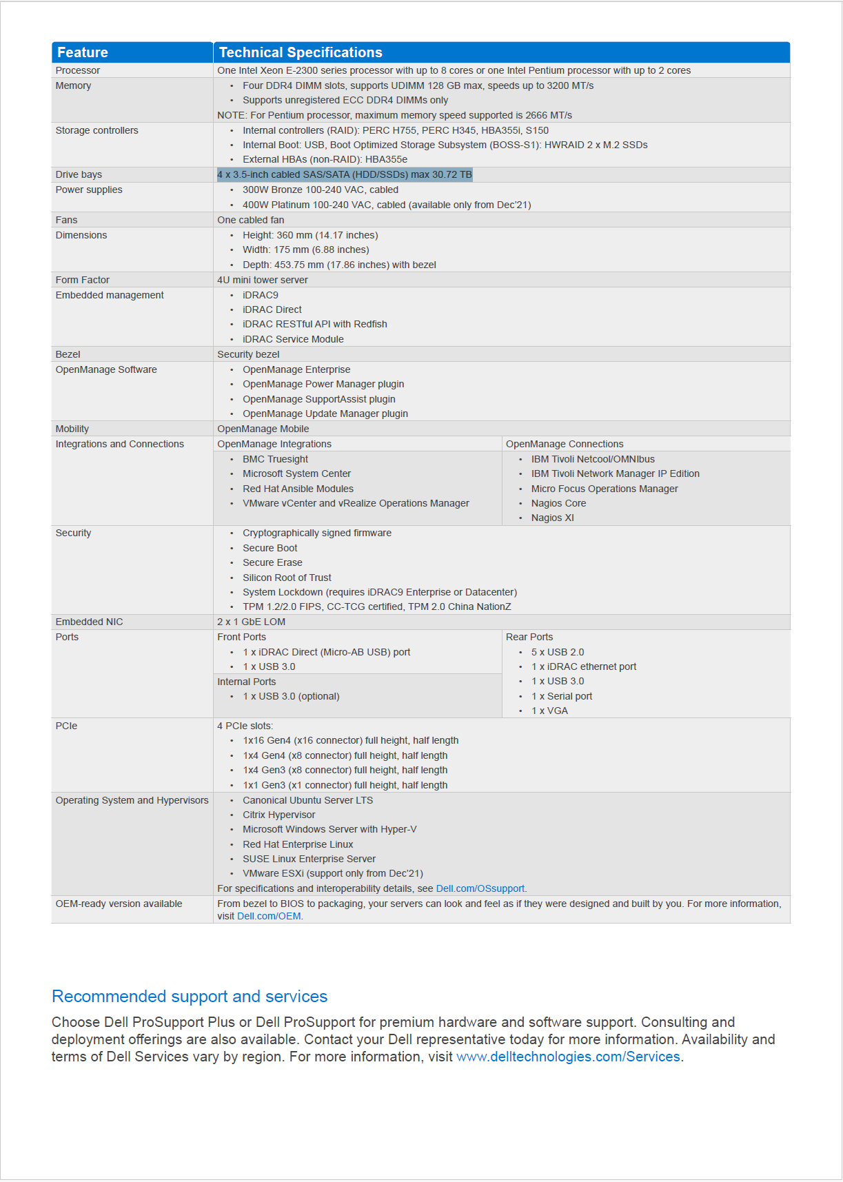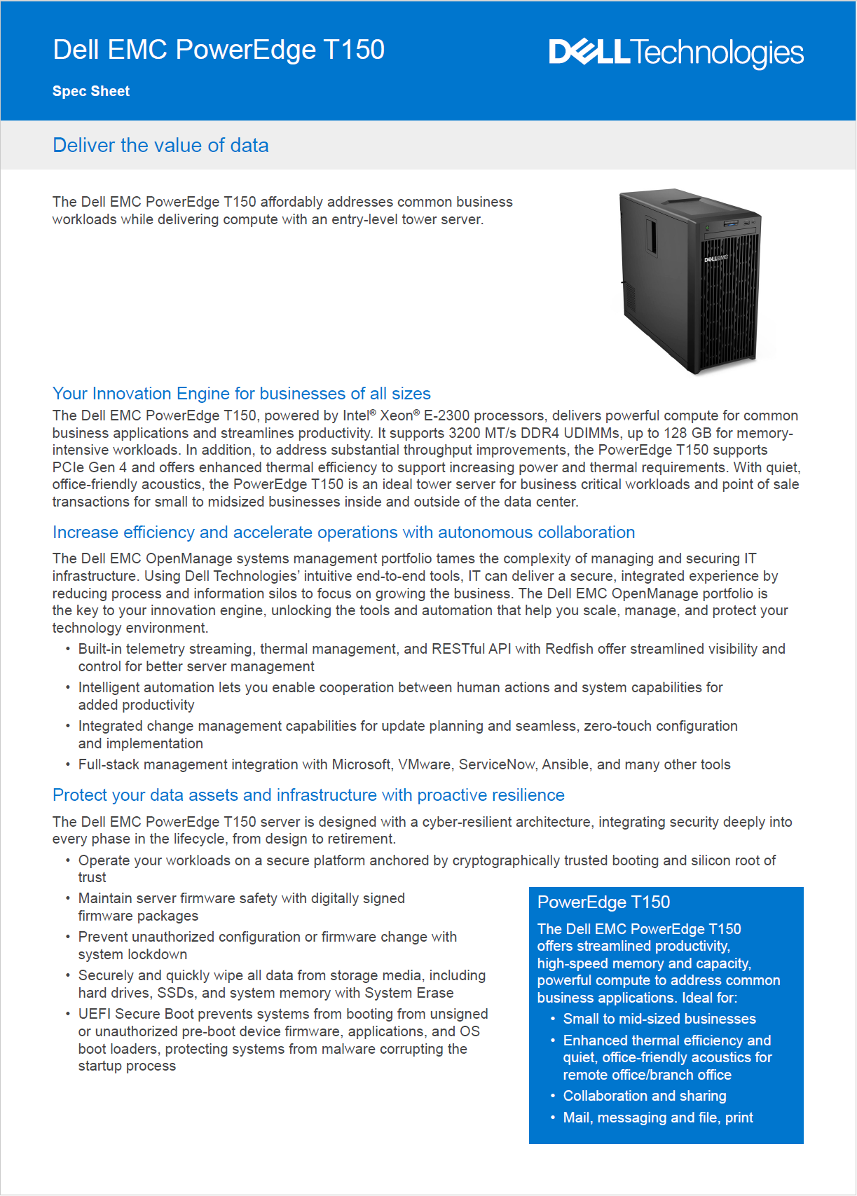 خادم برج Dell PowerEdge T150 بمعالج Xeon E2314 بسرعة ٢٫٨ جيجاهرتز رباعي النواة، ذاكرة ١٦ جيجابايت ECC DDR4، قرص صلب ٢ تيرابايت