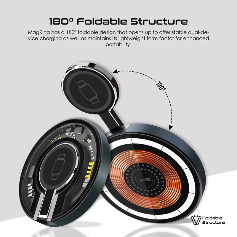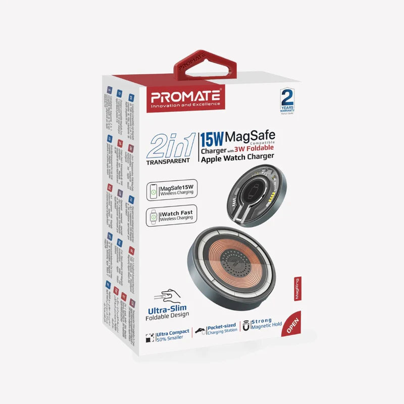 شاحن Promate MagRing 2-in-1 Pocket قابل للطي بقدرة 15 واط MagSafe و3 واط لساعة Apple Watch لاسلكيًا — تصميم حلقي شفاف، مع حامل مدمج، ومنفذ USB‑C