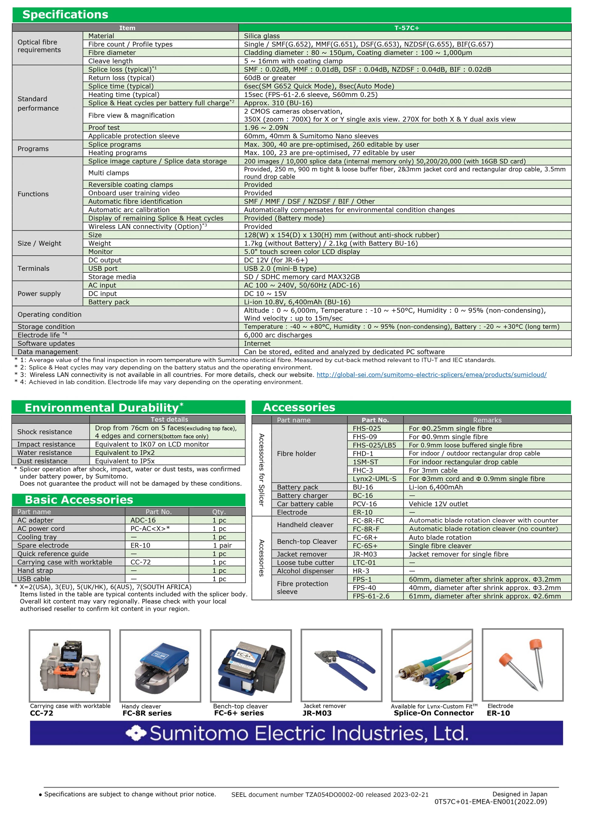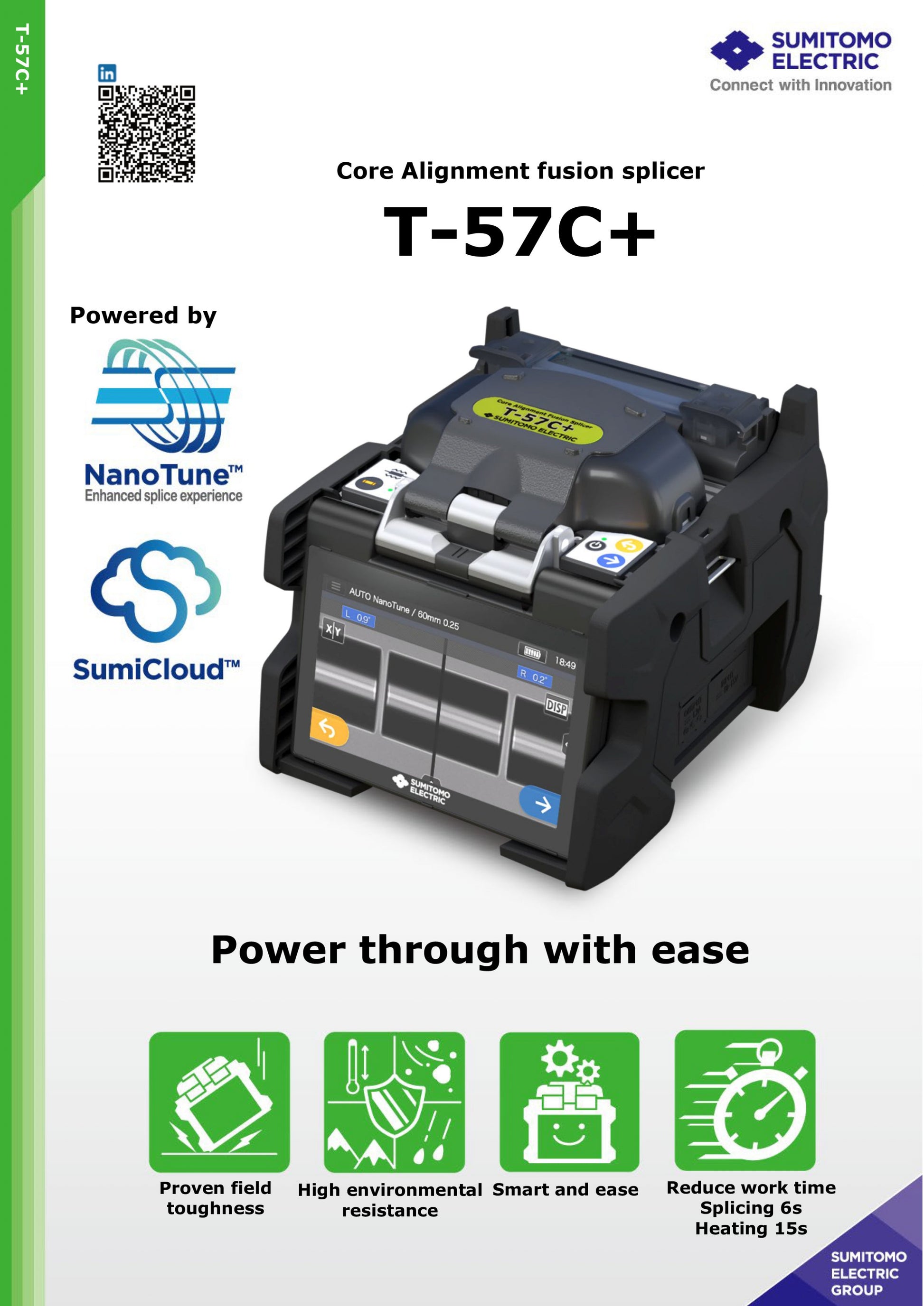 يوفر جهاز الربط الانصهاري T-57C+ من سوميتومو إلكتريك دقة عالية وسهولة في الاستخدام في توصيل الألياف الضوئية، مع ميزات متقدمة مثل NanoTune™ واتصال لاسلكي اختياري بالشبكة المحلية. صُمم الجهاز ليضمن المتانة والأداء، وهو مثالي للاستخدام في الميدان والمختبرات.