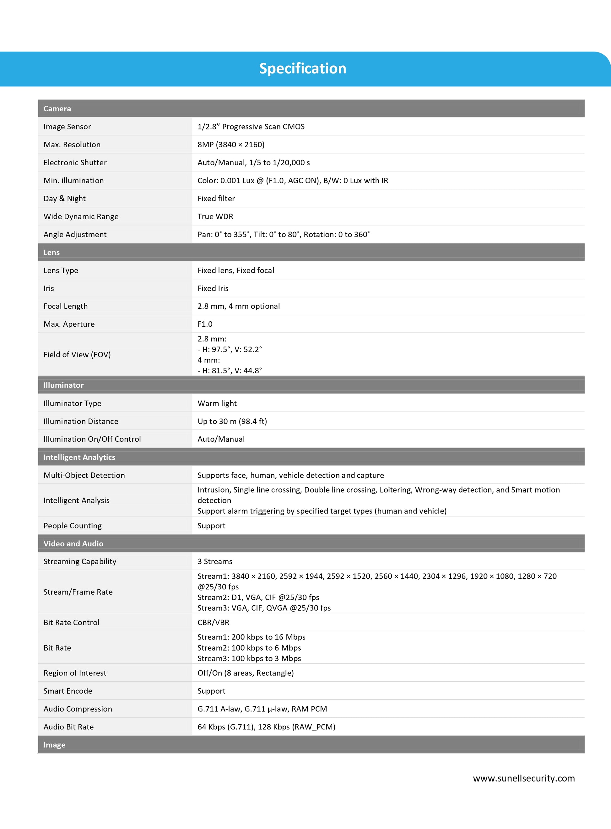 - دقة عالية: 8 ميجابكسل (3840 × 2160) بمعدل 25/30 إطارًا في الثانية باستخدام مستشعر STARVIS™ CMOS مقاس 1/2.8 بوصة.
