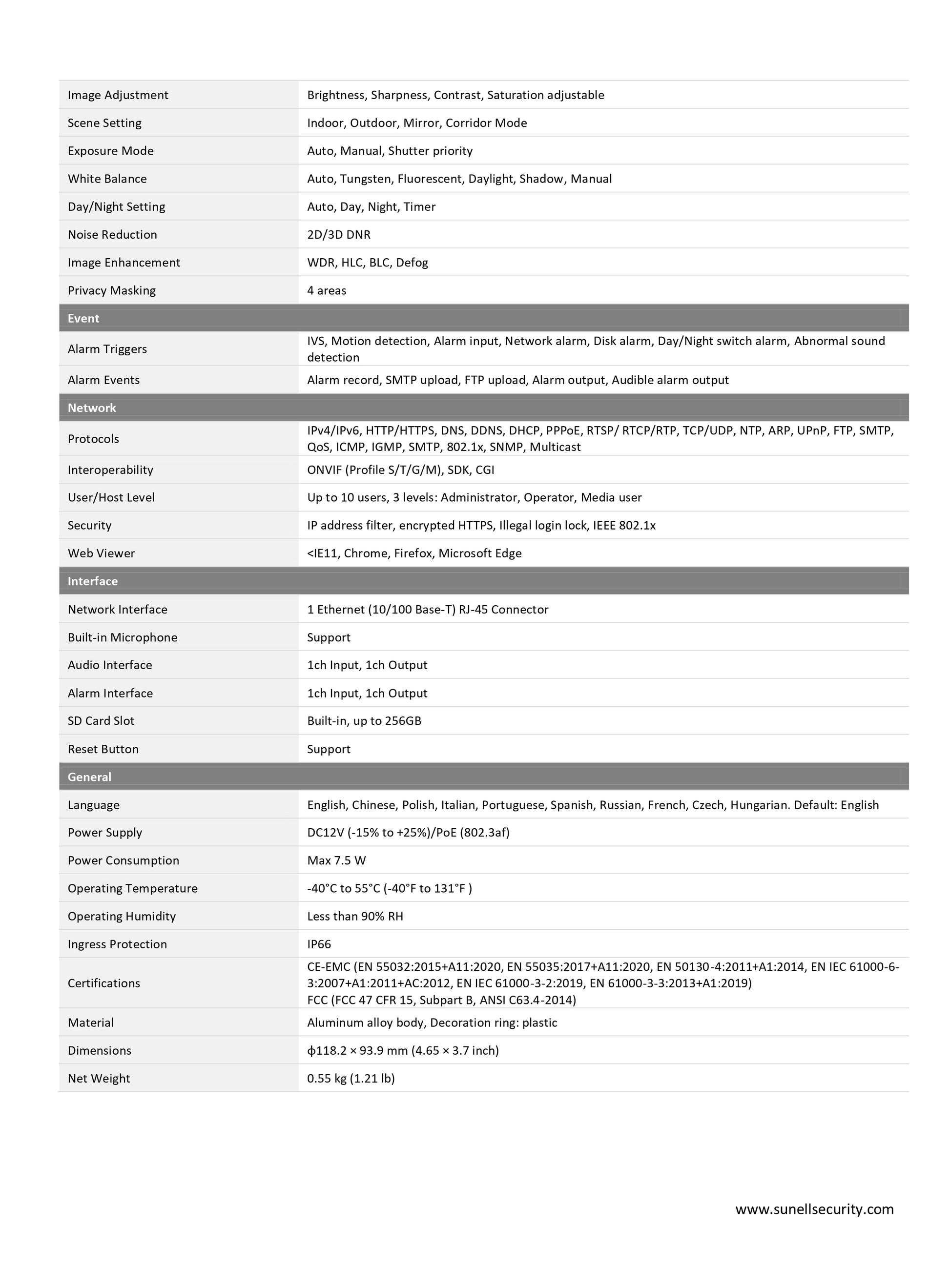 - الشبكة: ONVIF، HTTP/HTTPS، RTSP، DHCP، FTP، SNMP، إلخ.