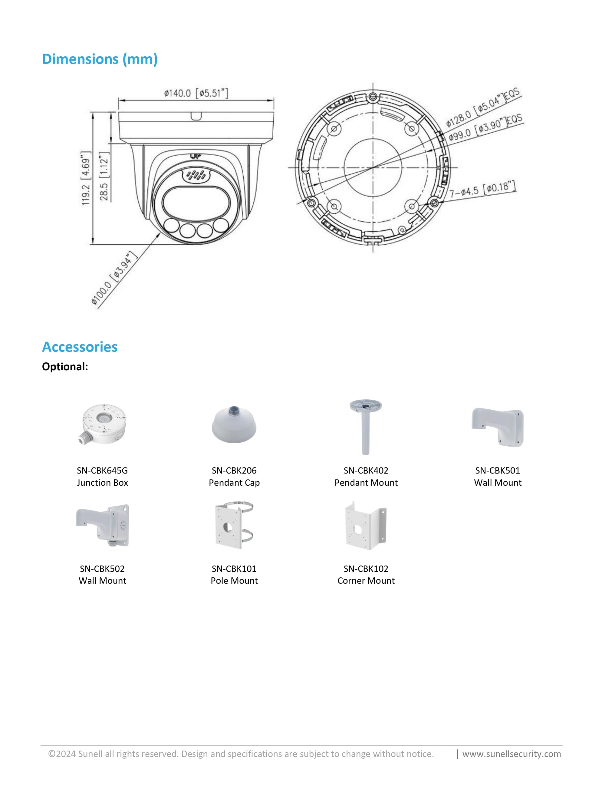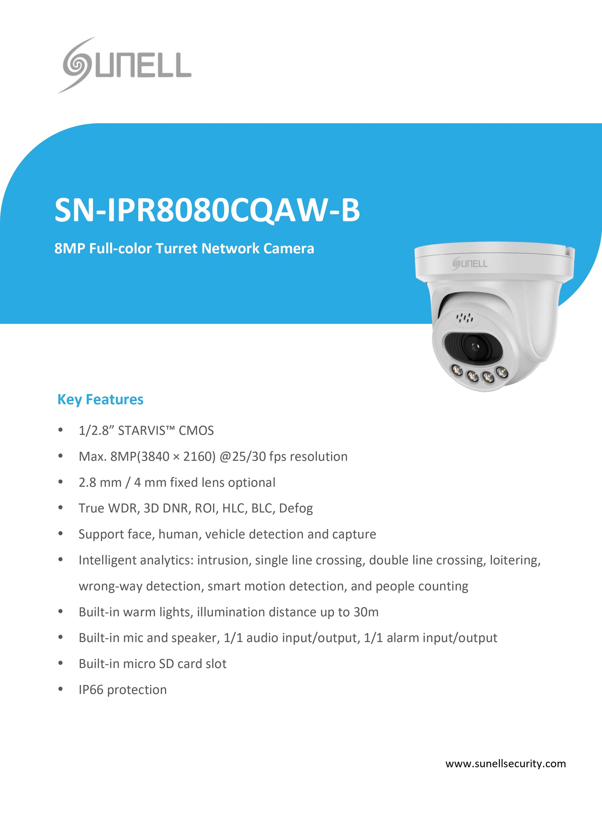 كاميرا IP كاملة الألوان SUNELL 8MP Dome Eyeball، عدسة 2.8 مم، ضوء دافئ 30 مترًا، صوت/إنذار I/O، كشف ذكي، فتحة SD، IP66