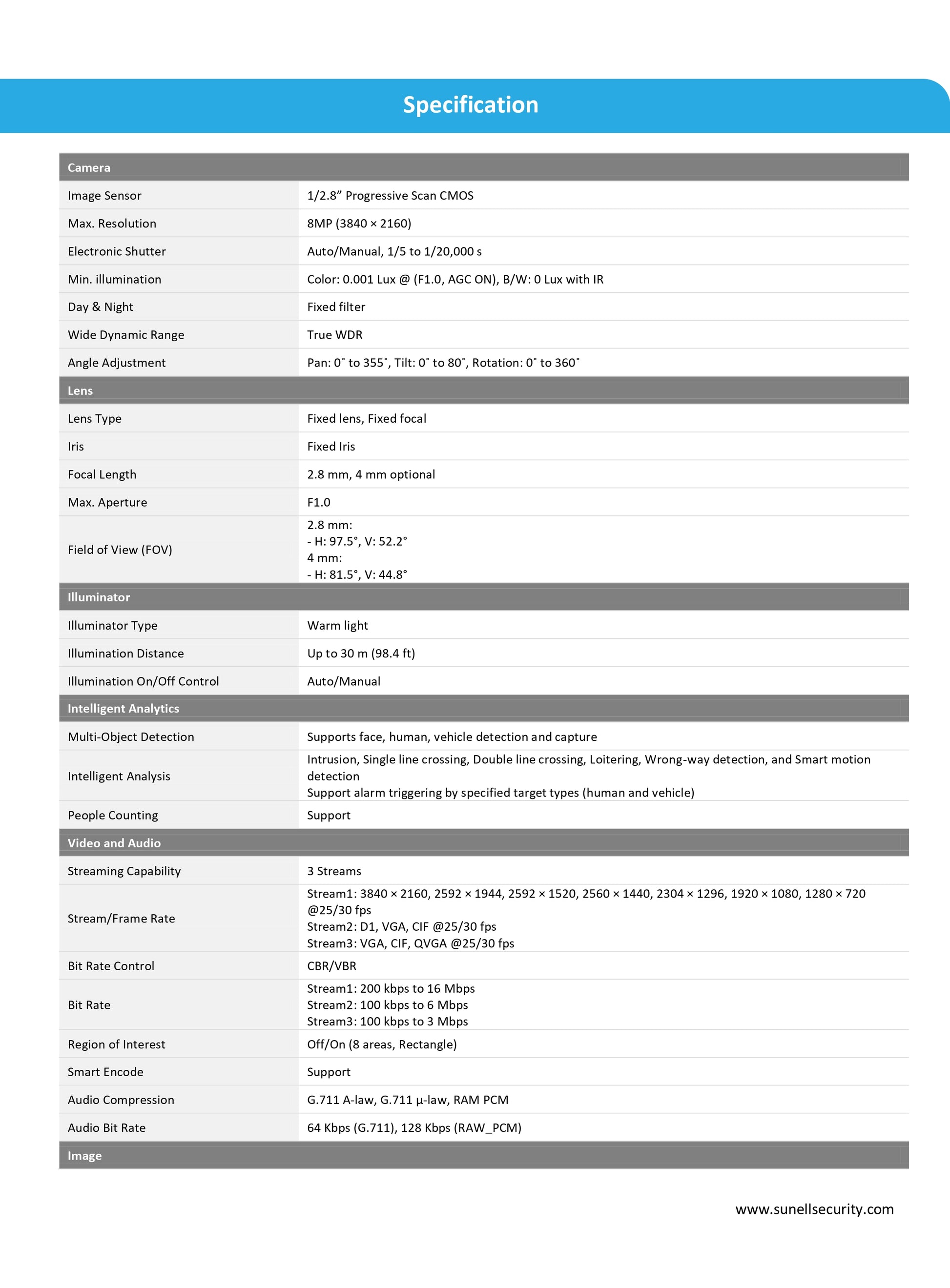 - الدقة: الحد الأقصى 8 ميجابكسل (3840×2160) بمعدل 25/30 إطارًا في الثانية مع مستشعر STARVIS™ CMOS مقاس 1/2.8 بوصة
