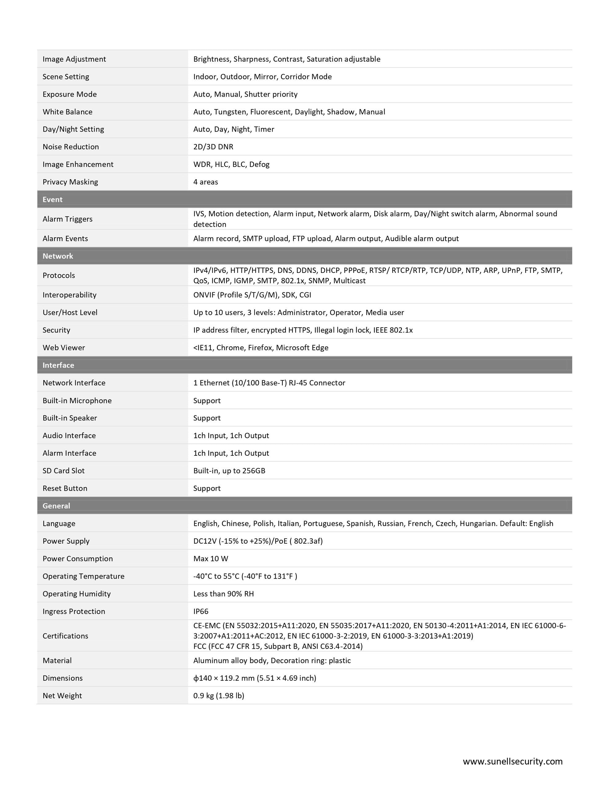 - الصوت والإنذارات: ميكروفون ومكبر صوت مدمجان، مدخل/مخرج صوت 1 قناة، مدخل/مخرج إنذار 1 قناة