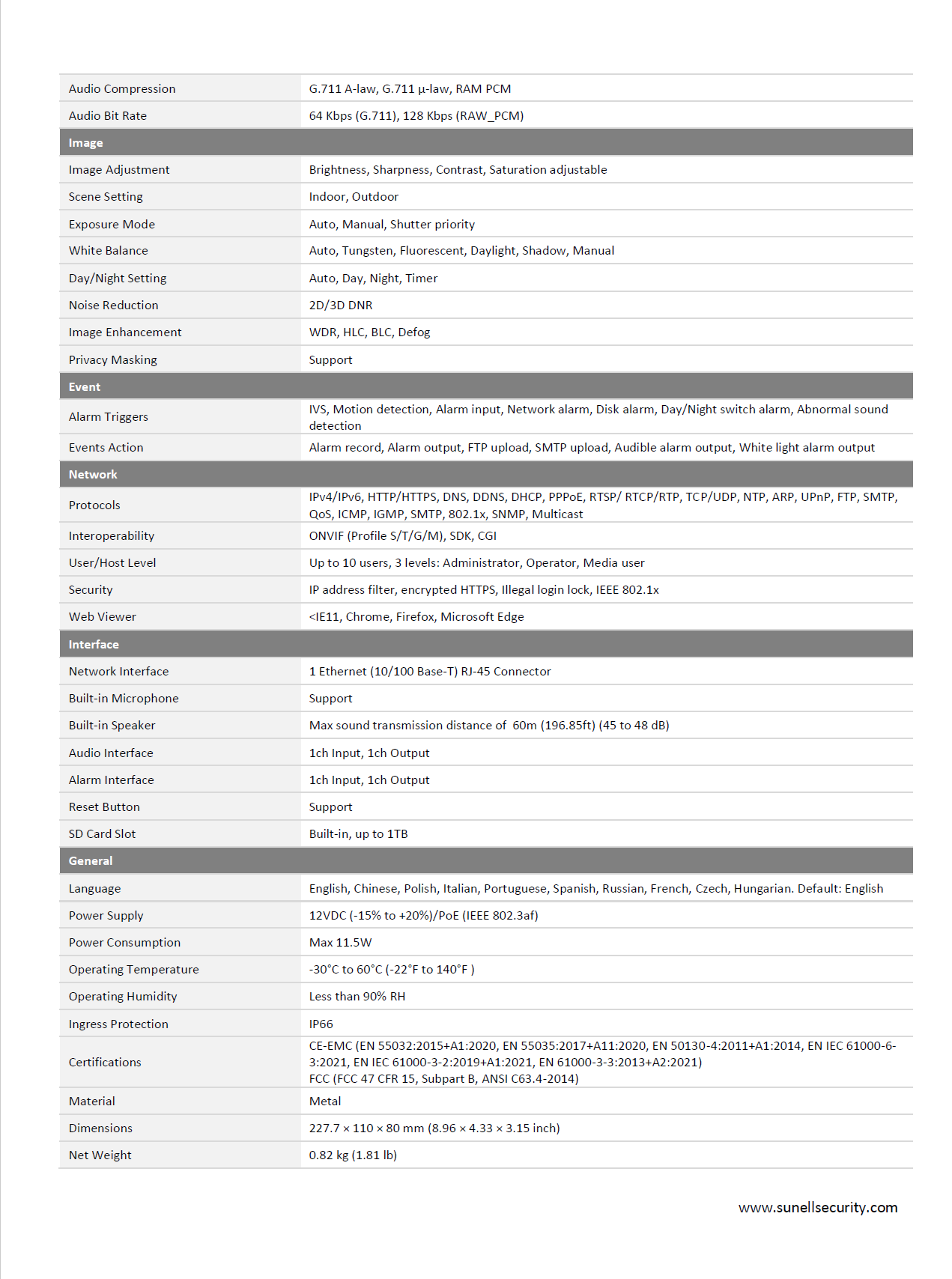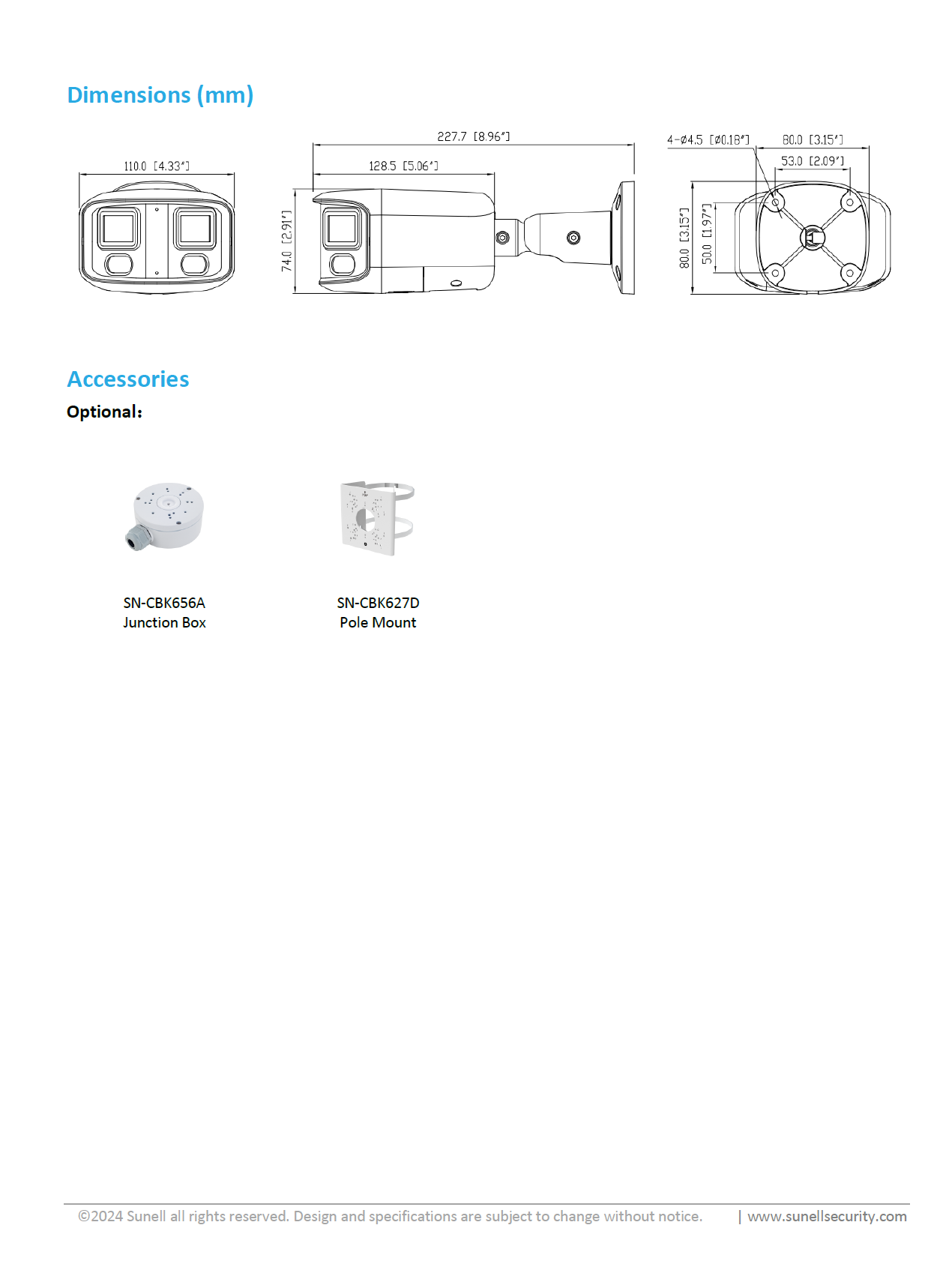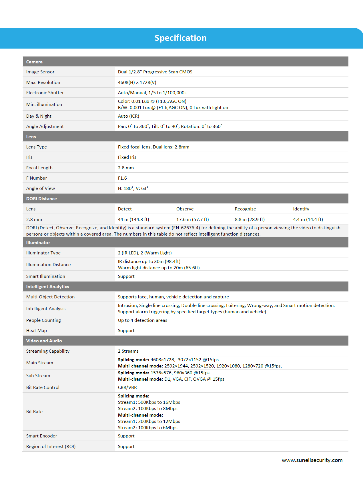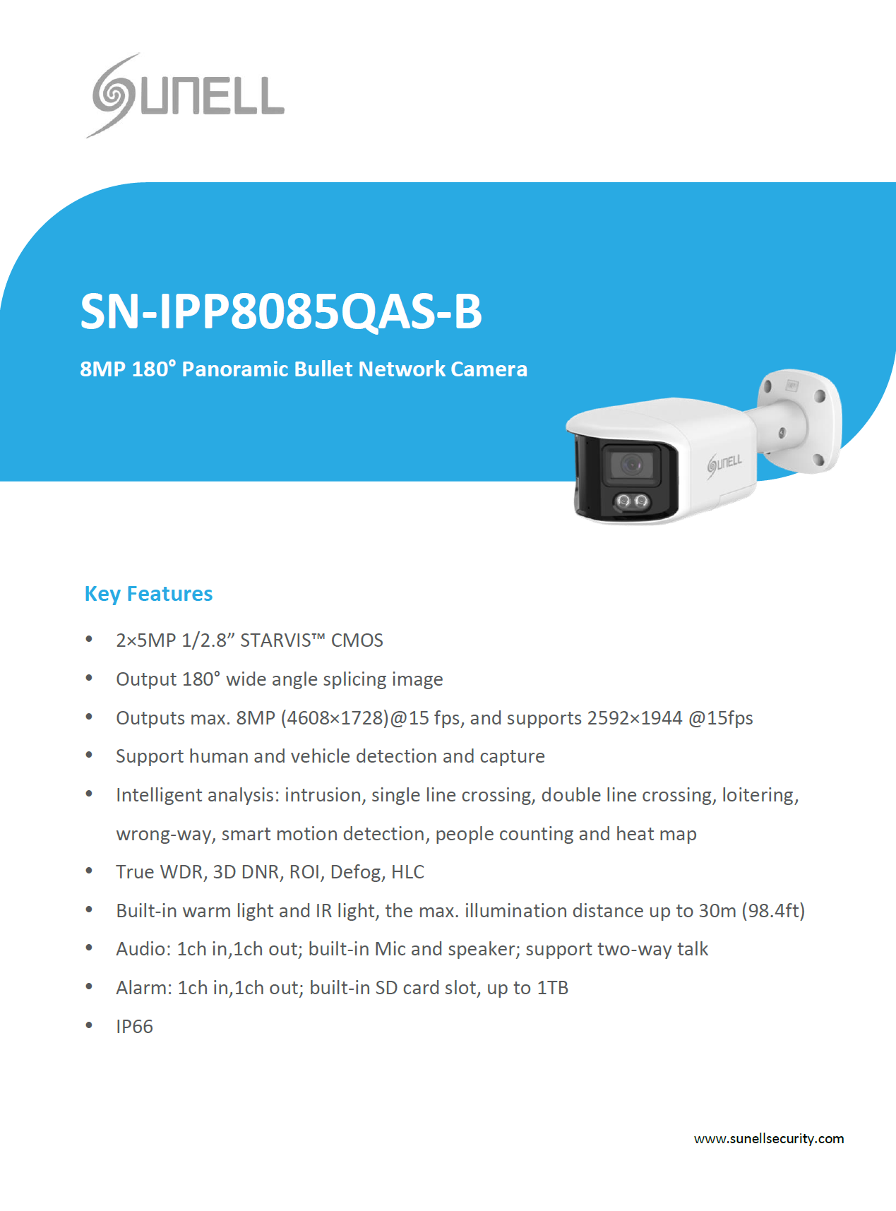 كاميرا Sunell 8MP Panoramic 180° شبكية رصاصية مع كشف الذكاء الاصطناعي وإضاءة مزدوجة ذكية