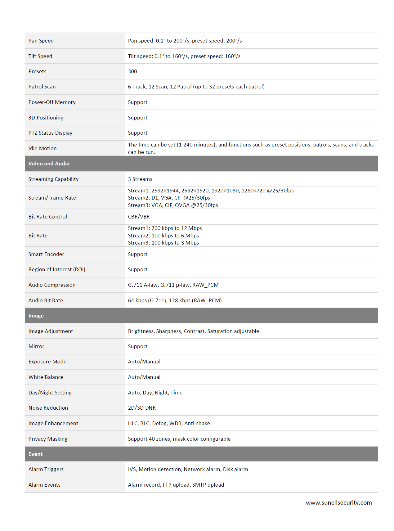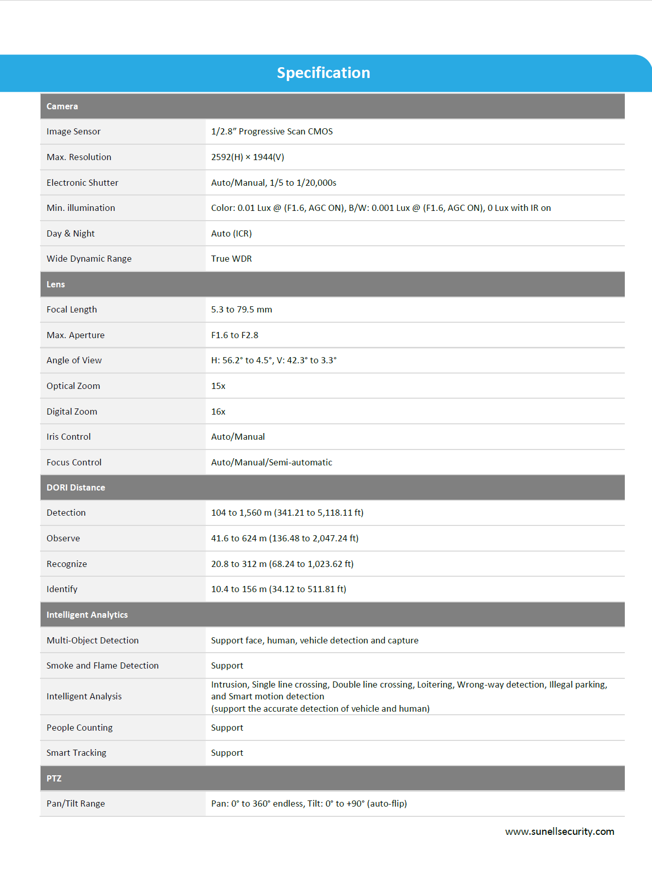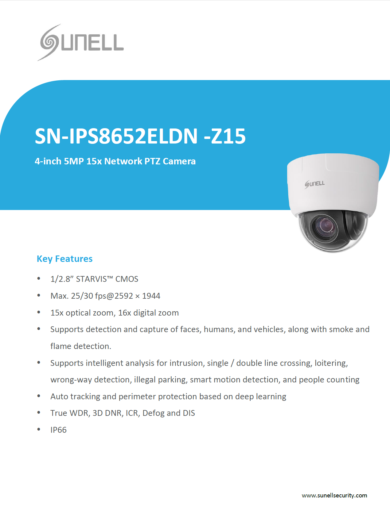 كاميرا Sunell 5MP 15x Starlight IR PTZ مع كشف الذكاء الاصطناعي ونطاق الأشعة تحت الحمراء 200 متر