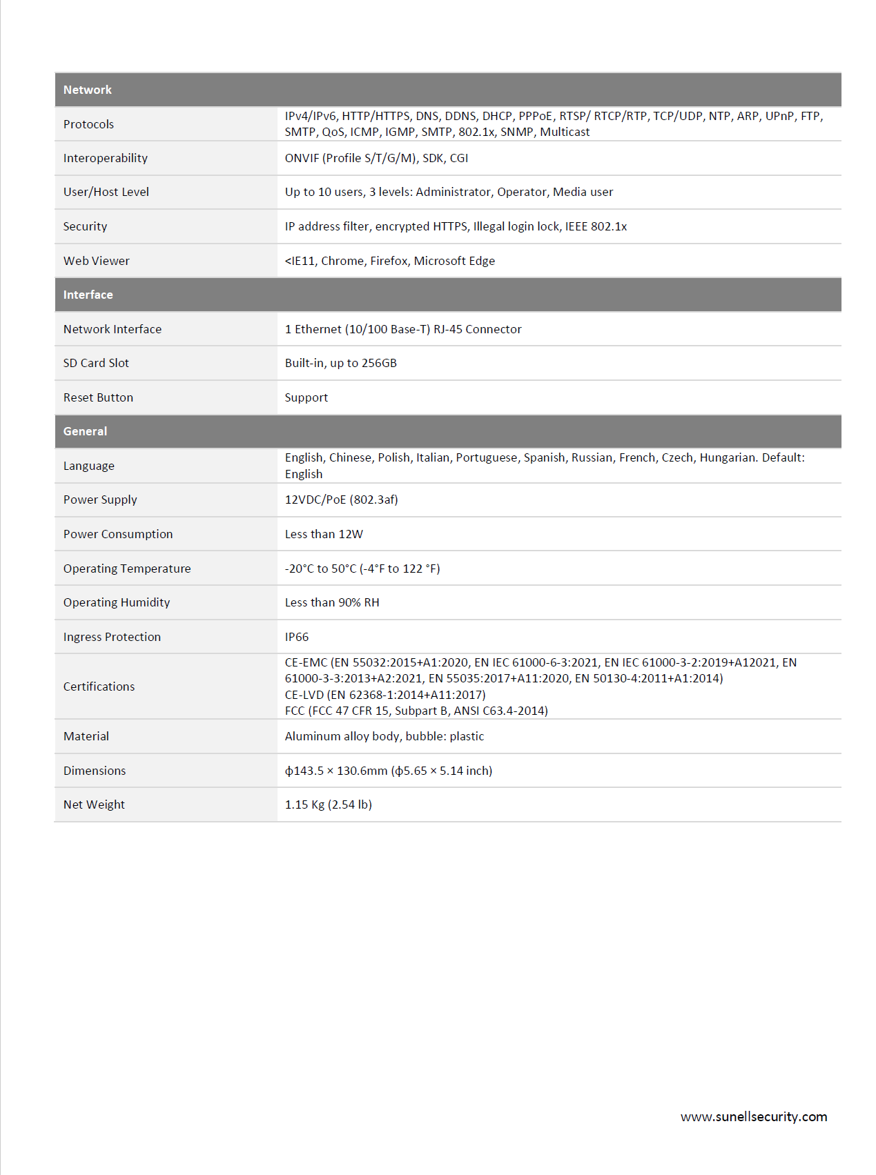 - البروتوكولات: IPv4/IPv6، HTTP/HTTPS، DNS، DDNS، DHCP، PPPoE، RTSP/RTCP/RTP، TCP/UDP، NTP، ARP، UPnP، FTP، SMTP، QoS، ICMP، IGMP، 802.1x، SNMP، Multicast