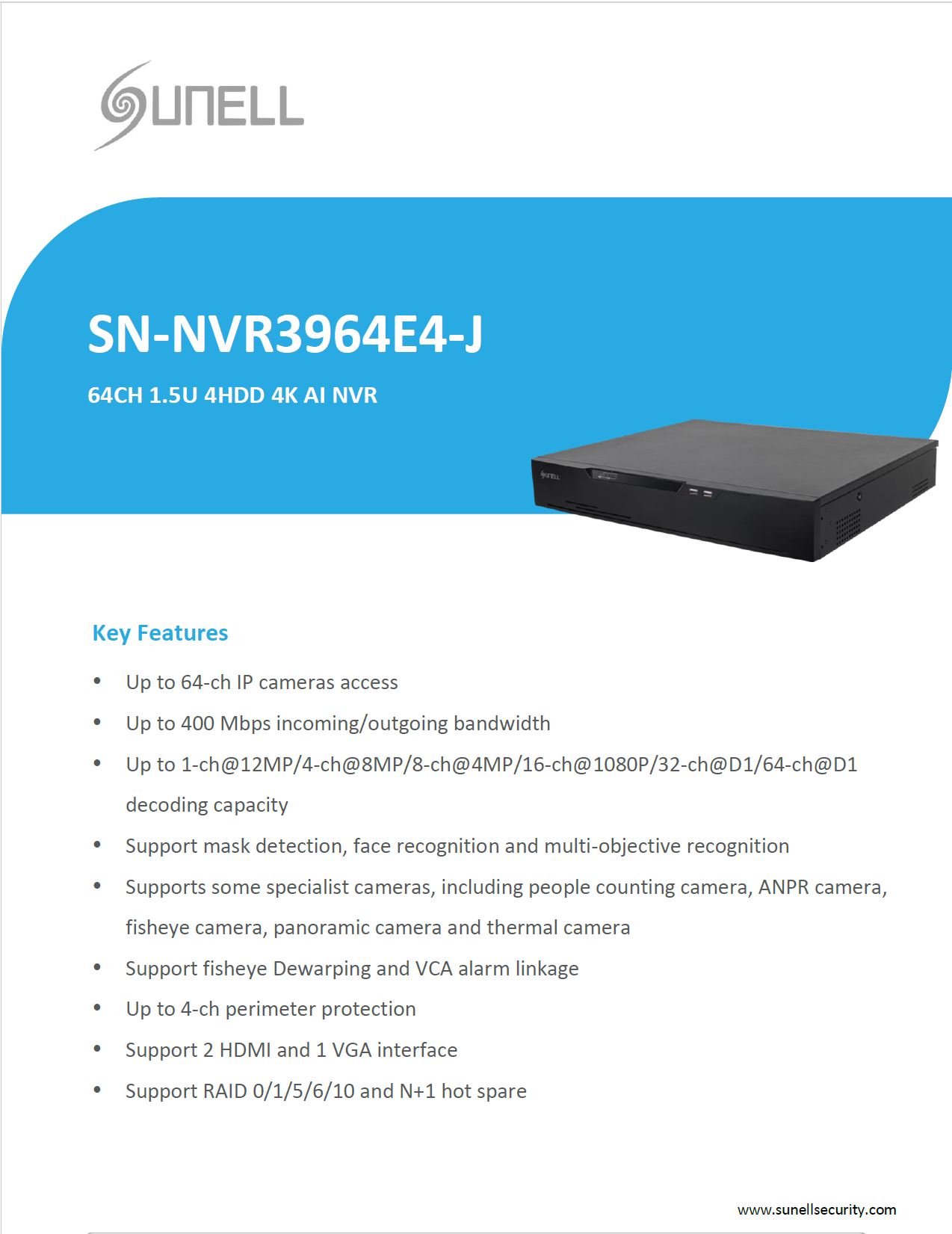 مسجل فيديو رقمي 4K من Sunell مزود بـ 64 قناة مع نطاق ترددي 400 ميجابت في الثانية ودعم RAID