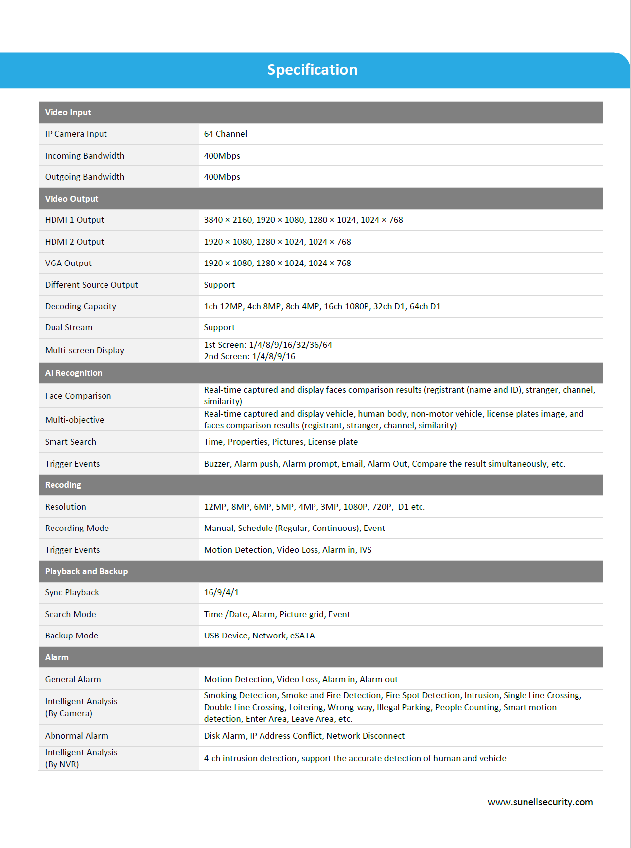 - سعة فك التشفير: قناة واحدة بدقة 12 ميجابكسل، 4 قنوات بدقة 8 ميجابكسل، 8 قنوات بدقة 4 ميجابكسل، 16 قناة بدقة 1080 بكسل، 32 قناة بدقة D1، 64 قناة بدقة D1