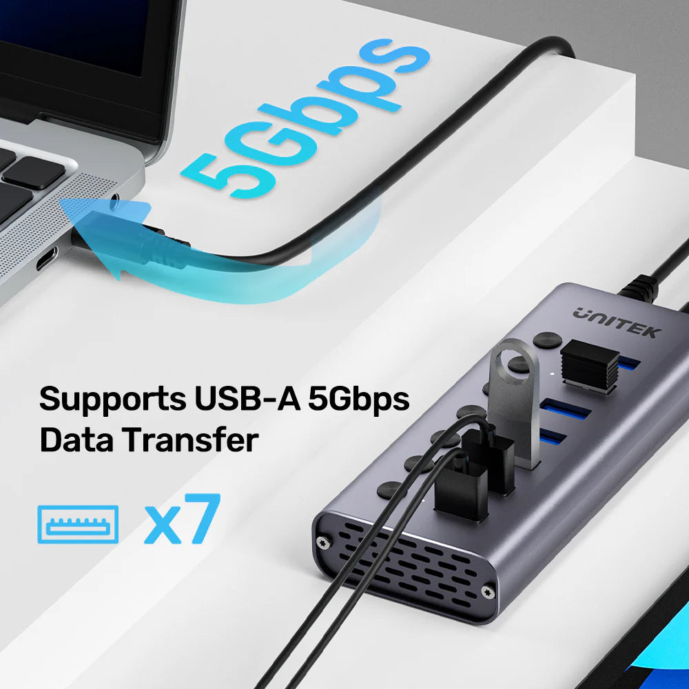 موزع USB 3.0 من UNITEK بـ 7 منافذ مع مفاتيح طاقة فردية - سرعة 5 جيجابت في الثانية، شحن سريع 2.4 أمبير، مدخل USB-A وUSB-C، سبيكة ألومنيوم، محول طاقة 12 فولت/2 أمبير