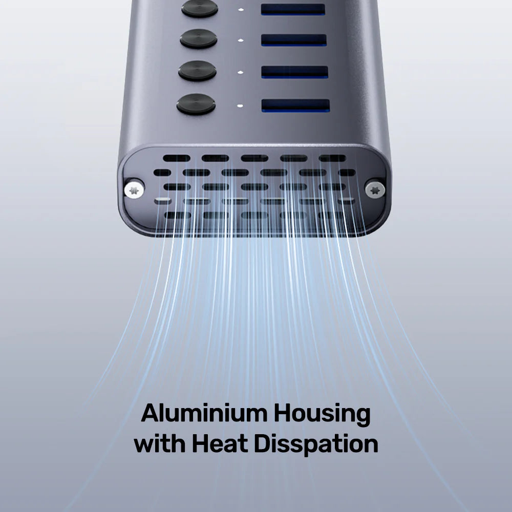 - المنافذ: 7 منافذ USB-A 3.0 (5 جيجابت في الثانية) مع مفاتيح طاقة فردية