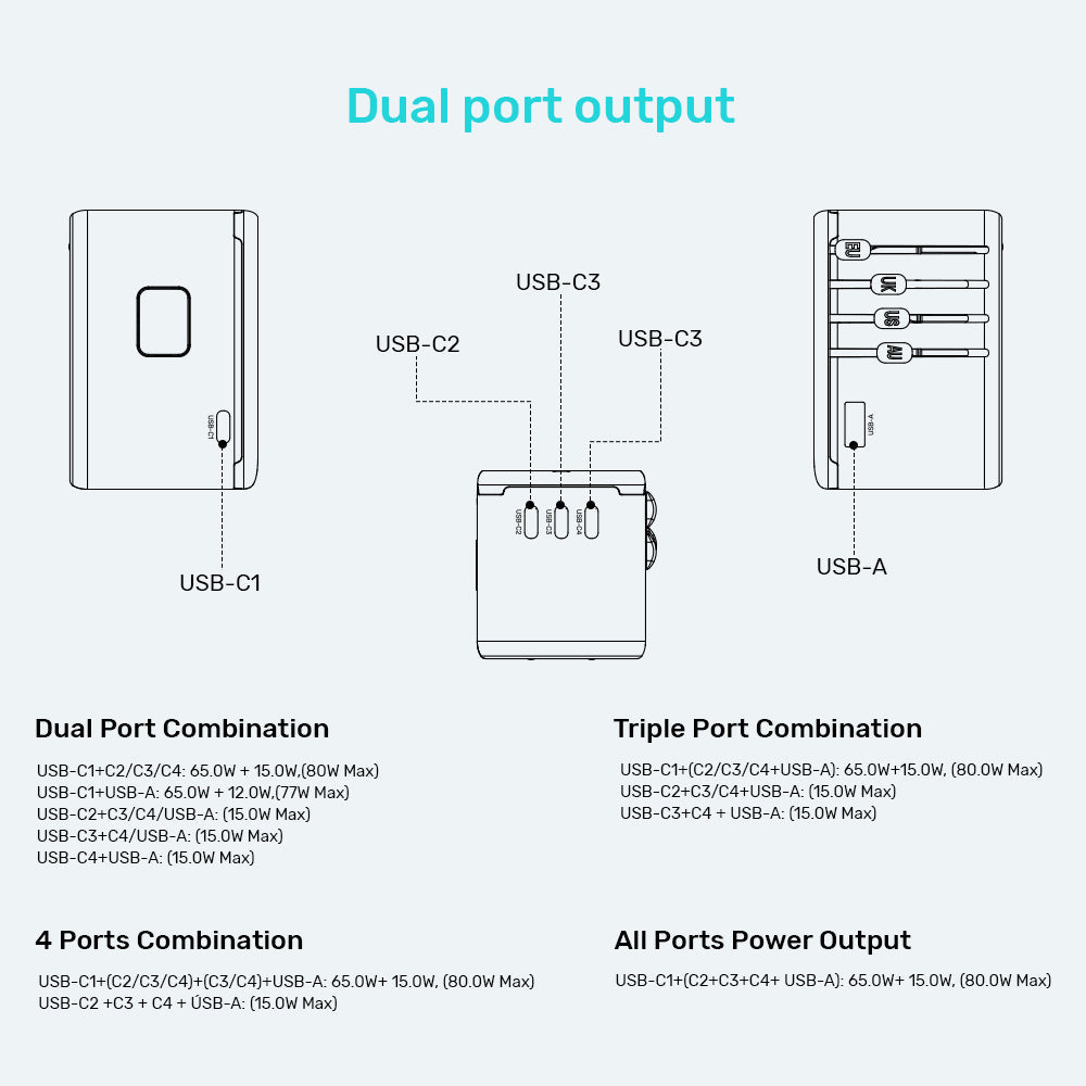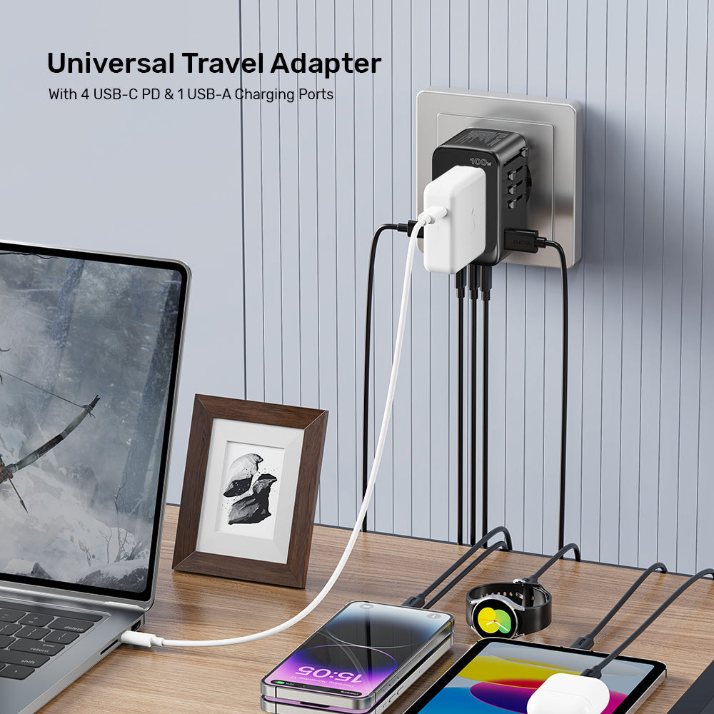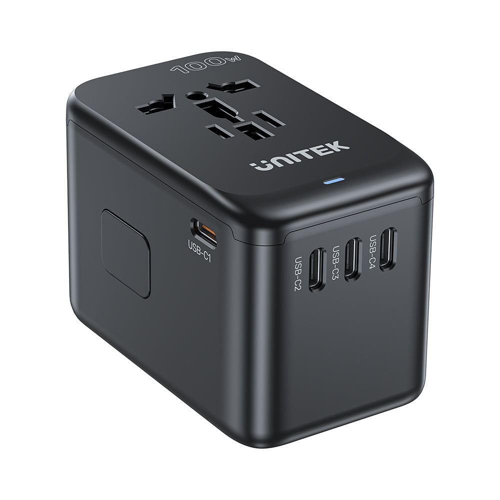Multi-port fast charging: UNITEK 100W universal travel adapter equips with 4 USB-C ports (Max 100W), 1 USB-A ports (Max 12W) and 1 AC outlet (2500W Max) and supports PD3.0 & QC3.0 fast charging.