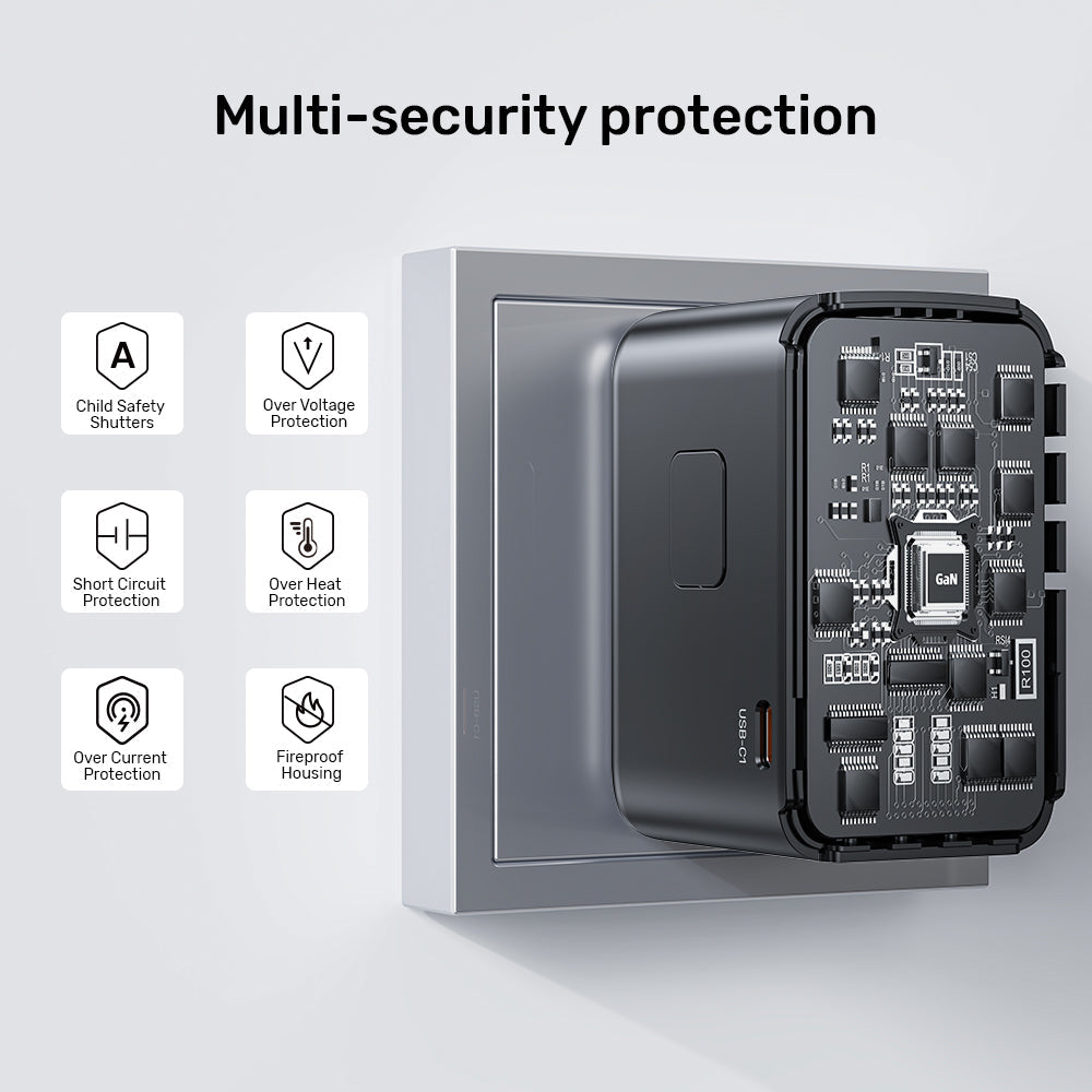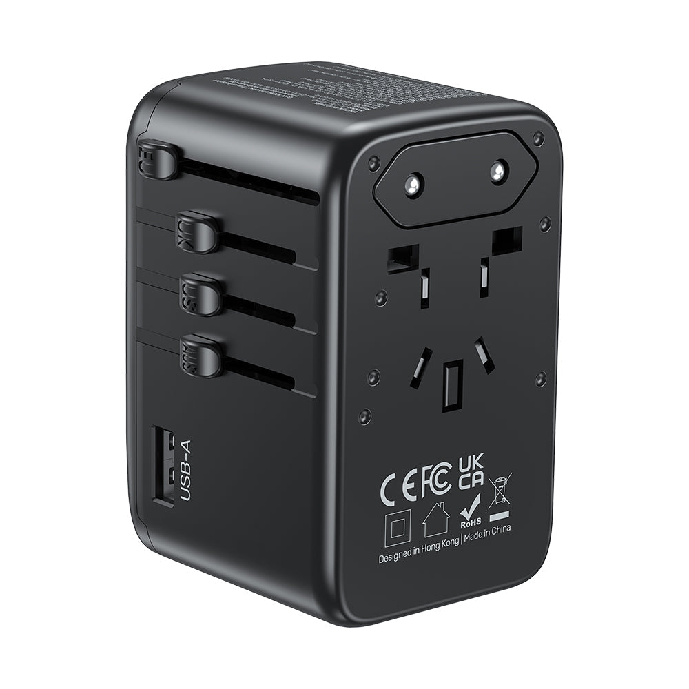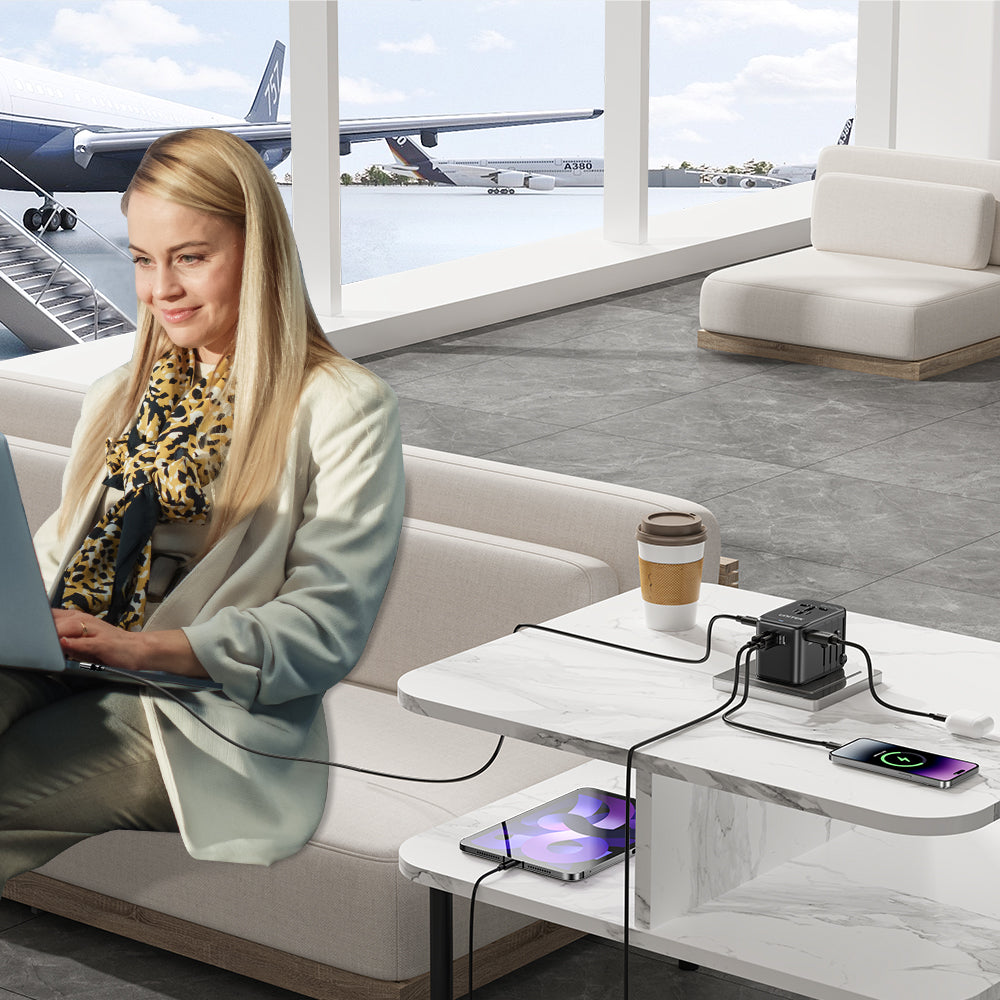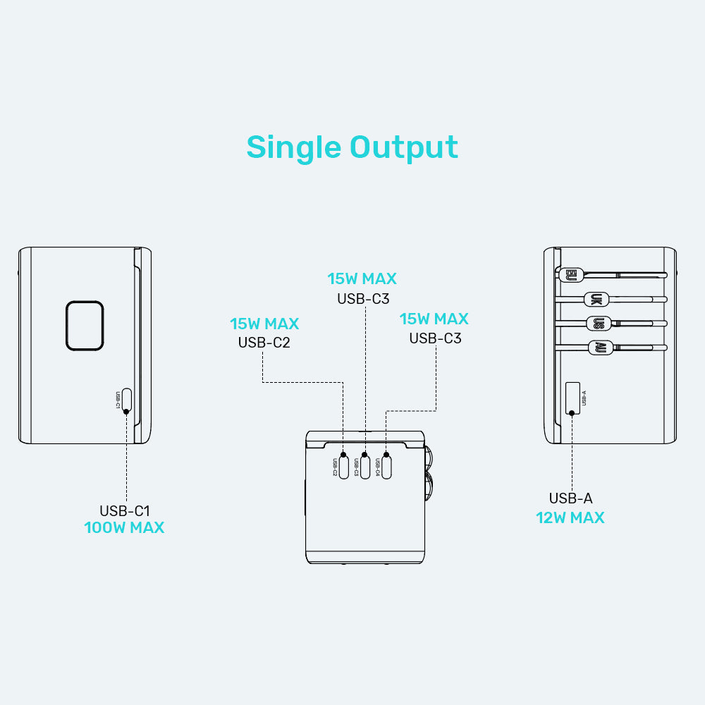 Multi-port fast charging: UNITEK 100W universal travel adapter equips with 4 USB-C ports (Max 100W), 1 USB-A ports (Max 12W) and 1 AC outlet (2500W Max) and supports PD3.0 & QC3.0 fast charging.