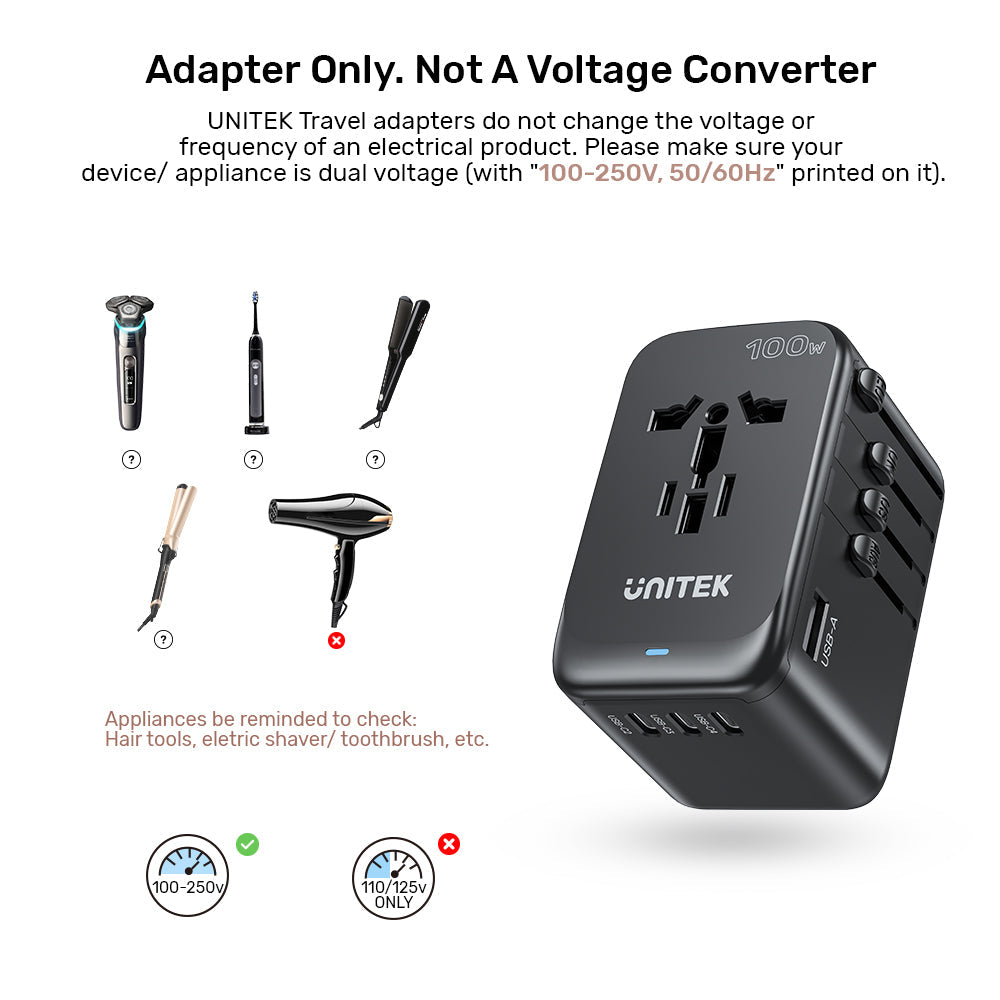 Versatile usage: Comes with EU, UK, AU and US plug, UNITEK 100W universal travel adapter can be used in virtually any countries. For safety concern, please do not use this product with voltage exceeds 250V.