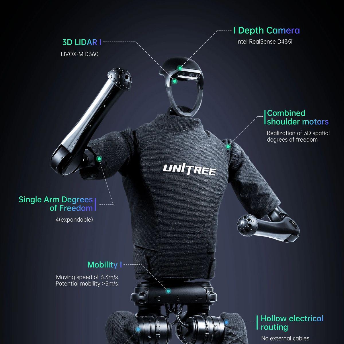 UNITREE H1 هو روبوت بشري بالحجم الكامل متعدد الأغراض، صُمم لتحقيق أقصى سرعة وعزم دوران وتحمل والتنقل في العالم الحقيقي. يبلغ ارتفاعه حوالي ١٨٠ سم ووزنه حوالي ٤٧ كجم، ويوفر رشاقة وإدراك لا مثيل لهما للبحث المتقدم والصناعة والتعليم.