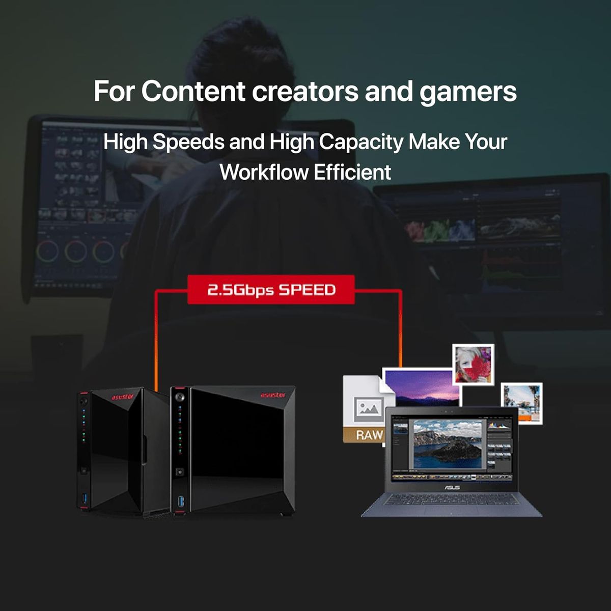 ASUSTOR Nimbustor 4 AS5404T is a high-performance 4-bay NAS designed for home labs, creative workloads, and small business environments. It combines an Intel Celeron processor, fast networking, and NVMe SSD caching support for responsive storage performance.