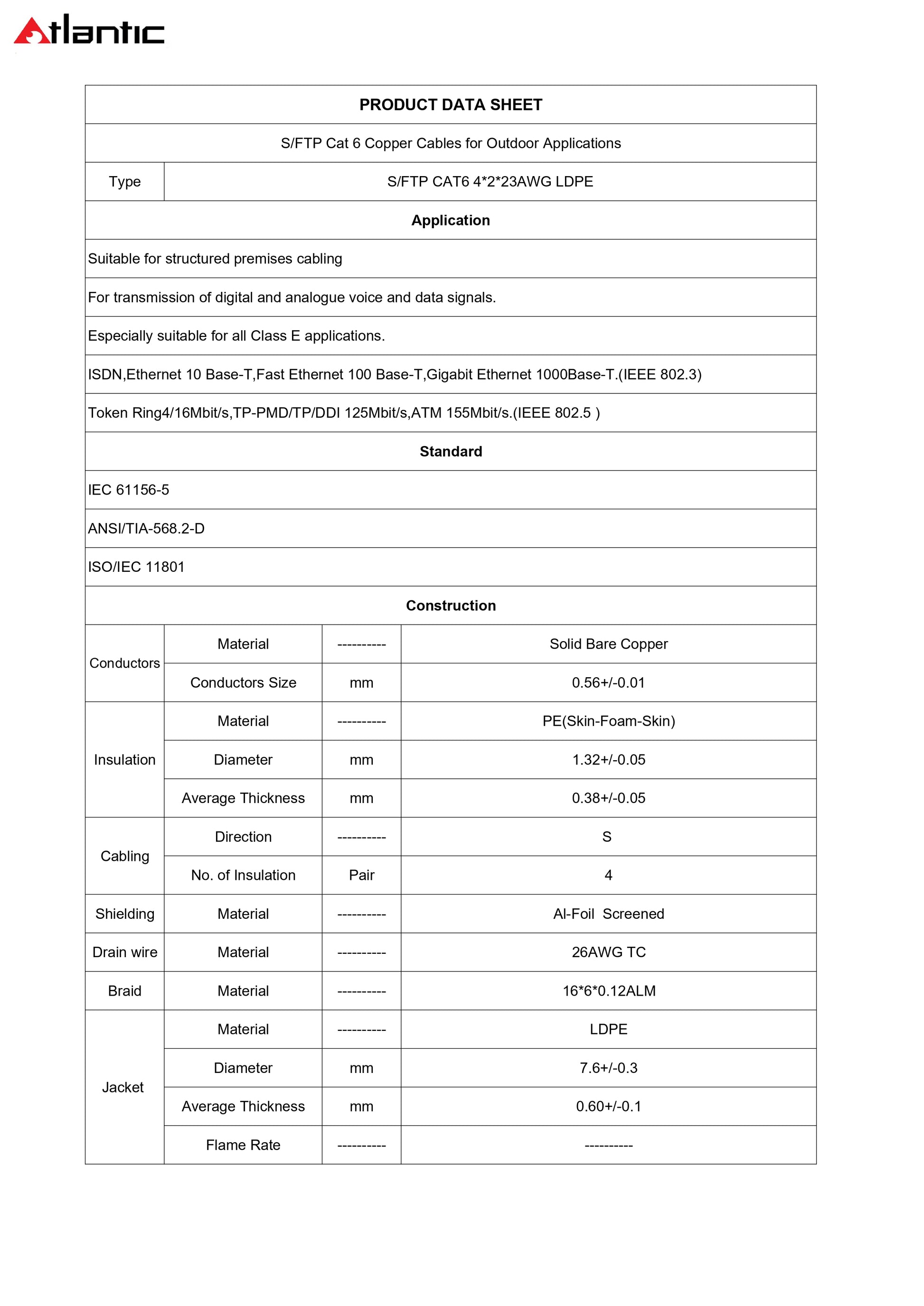 Type: S/FTP CAT6 4*2*23AWG LDPE