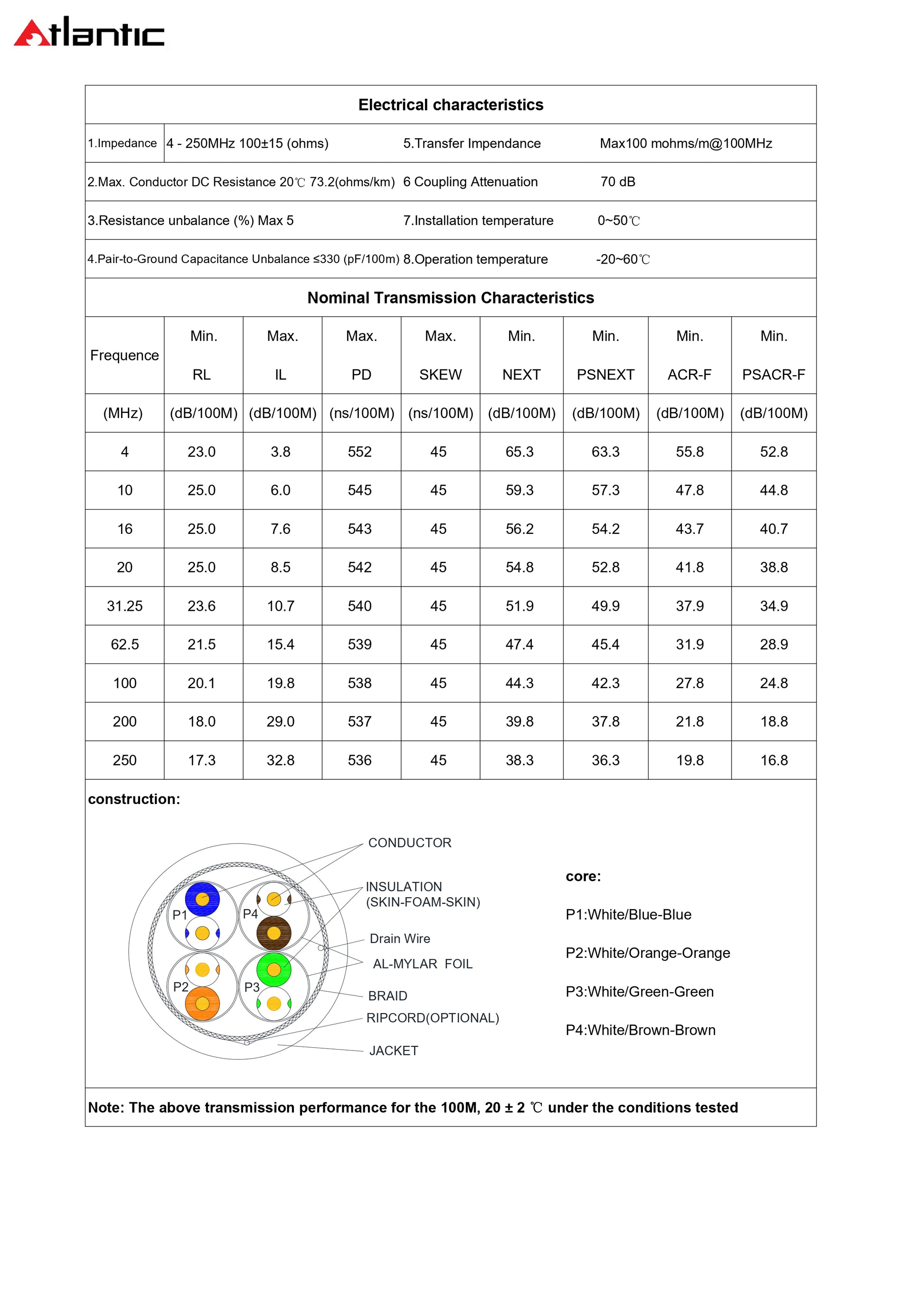 - Pair-to-Ground Capacitance Unbalance: ≤330 pF/100m