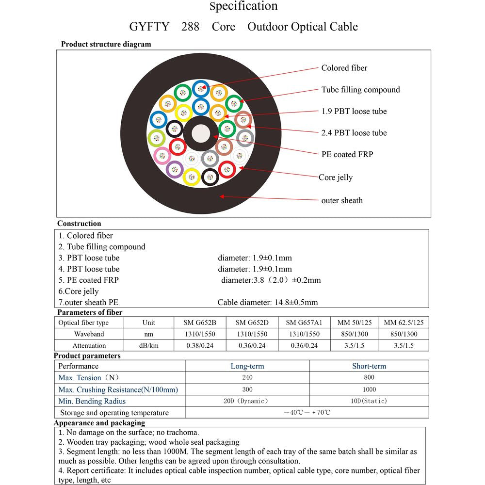 | Construction | 288 Core, Colored Fibers, Tube Filling Compound, PBT Loose Tube, PE Coated FRP |