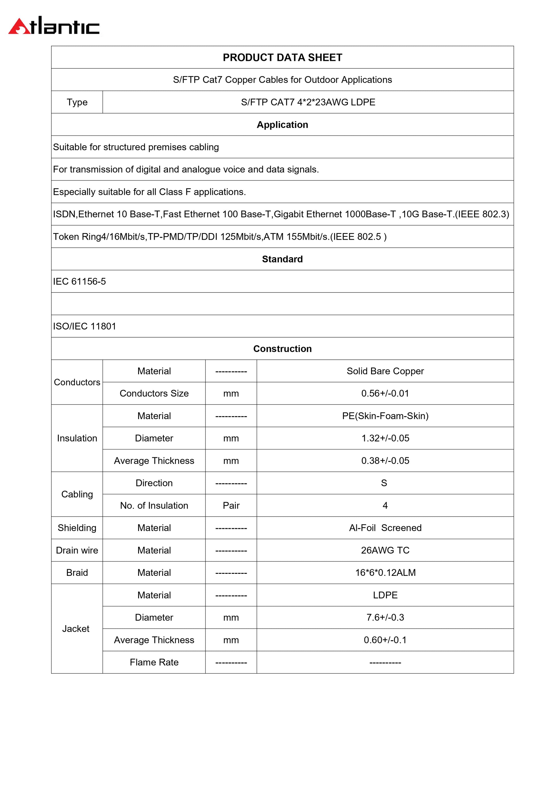 Type: S/FTP CAT7 4*2*23AWG LDPE