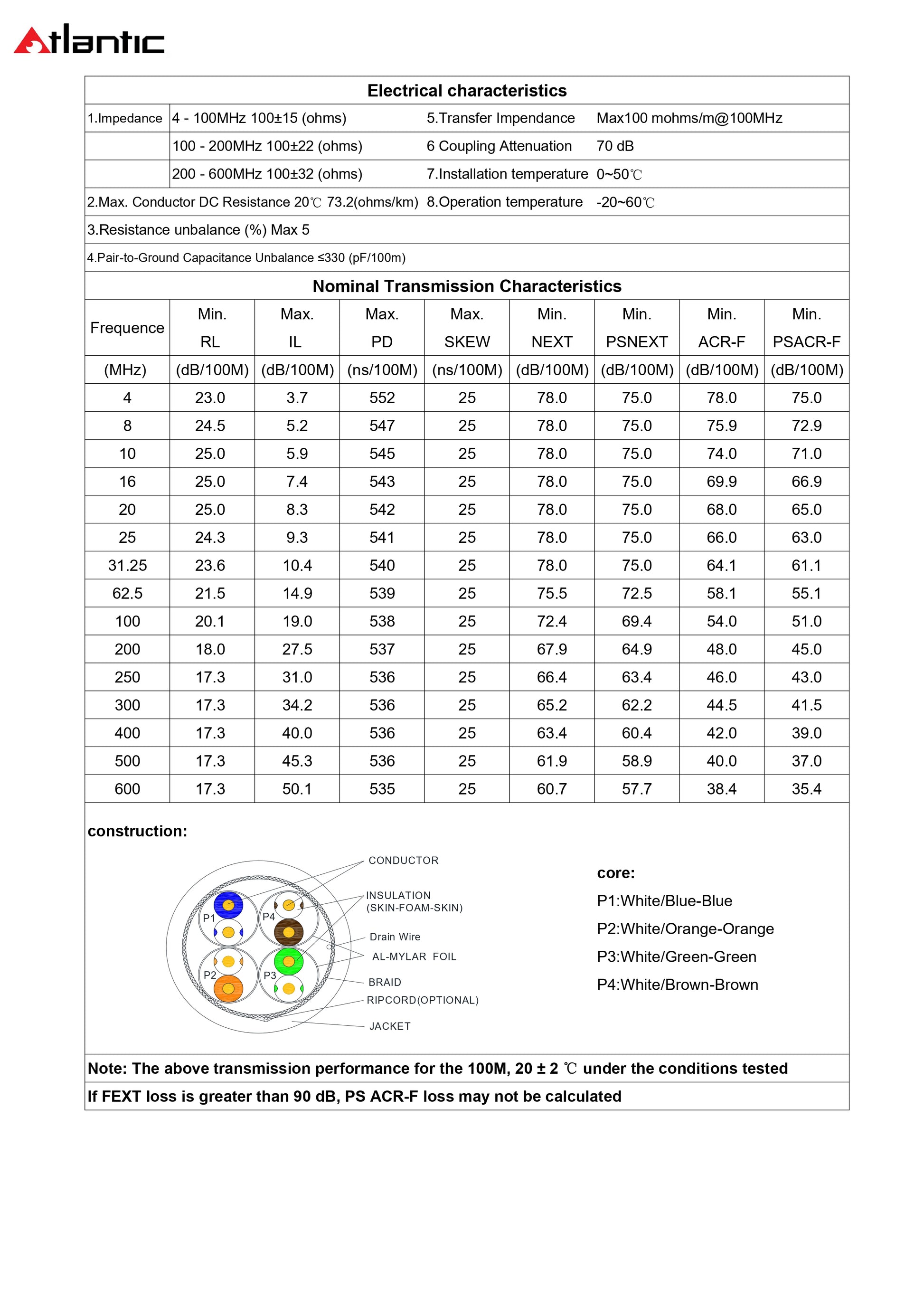 - Pair-to-Ground Capacitance Unbalance: ≤330 pF/100m