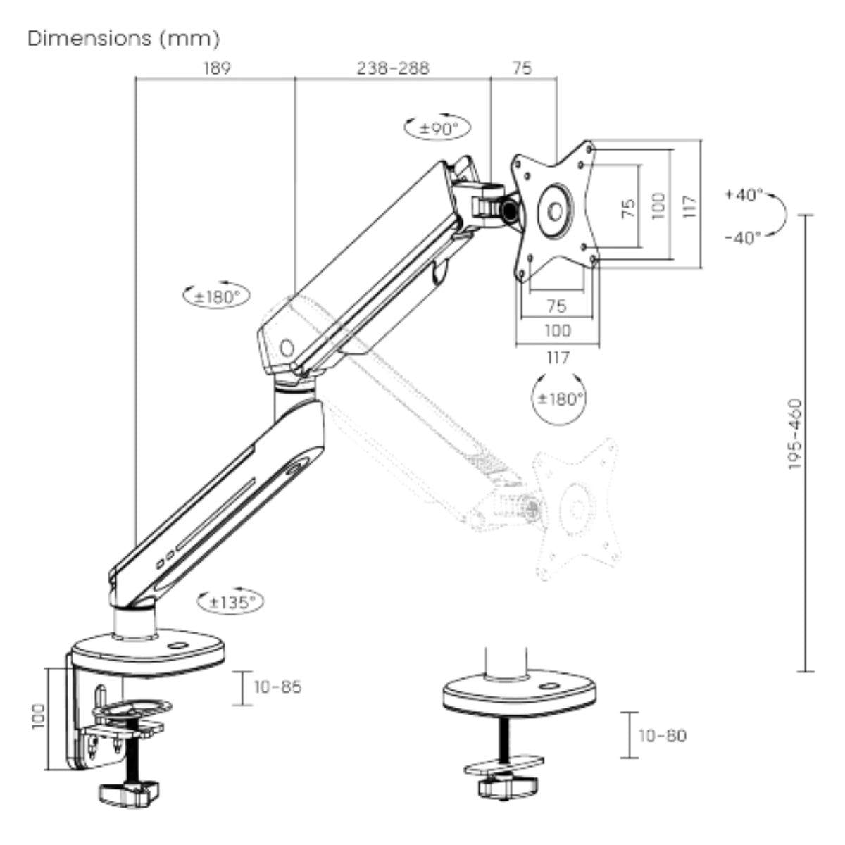 - Suggested Desktop Thickness: Clamp: 10–85mm (0.39"–3.3"), Grommet: 10–80mm (0.39"–3.1")