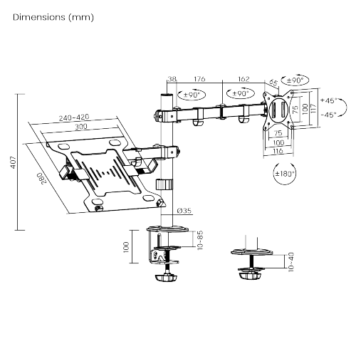 Avetron MA401 Steel Articulating Monitor Arm with Laptop Tray – Supports 17″–32″, 9 kg Load, Full Motion