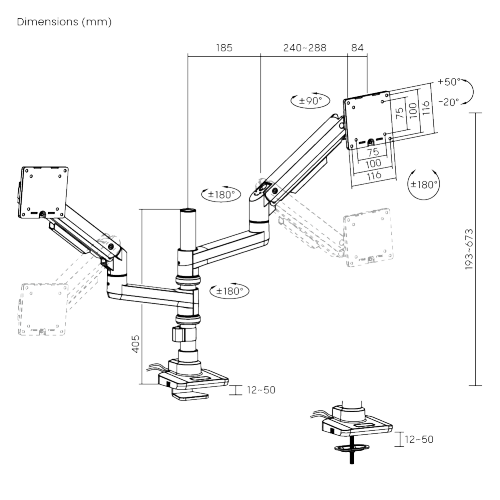 - Arm Full Horizontal Extension: 425 mm (16.7″)
